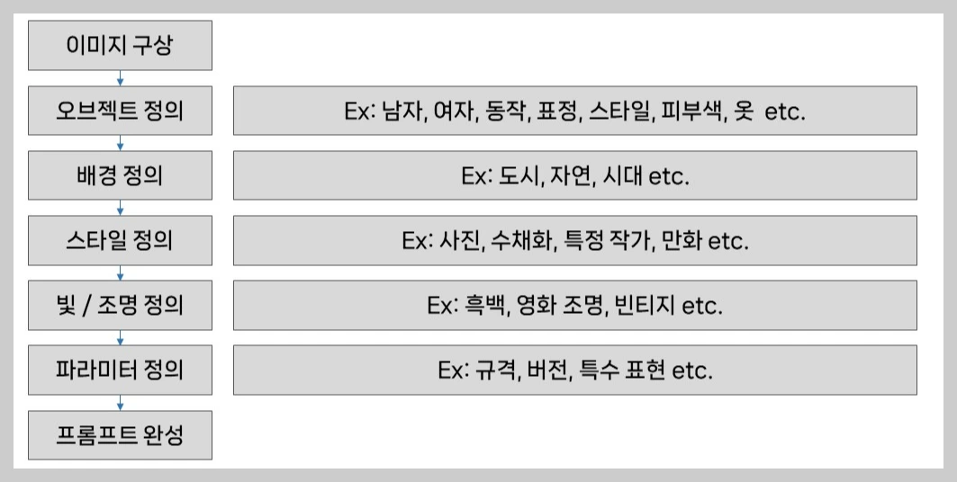 파라미터에는 정답은 없습니다. 하지만 이미지가 가지고 있는 요소들로 분류를 해서 체계화 하면 목표에 맞는 이미지를 생성하는데 도움이 됩니다. 오브젝트, 배경, 스타일, 빛, 조명 등의 프롬프트를 따로 분류해서 정의하는 것도 좋은 방법입니다.