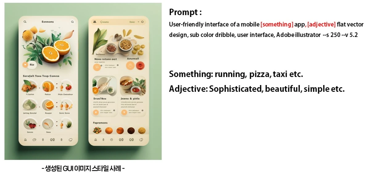 실제로 '미드저니'를 활용한 다양한 디자인 사례를 살펴보면, 이 기술의 잠재력을 더욱 잘 이해할 수 있습니다. 예를 들어, 친환경 푸드 앱의 GUI 디자인을 위해 "아름답고 단순한 플랫 벡터 디자인으로 친환경 푸드 앱 UI를 만들어줘"라고 프롬프트를 설정할 수 있습니다. AI는 이 프롬프트를 기반으로 다양한 친환경 푸드 앱 디자인을 생성해내며, 디자이너는 이 중에서 가장 적합한 디자인을 선택하여 작업을 진행할 수 있습니다. 다른 앱 디자인이 필요하면 앱에 대한 키워드만 바꿔주면 됩니다.