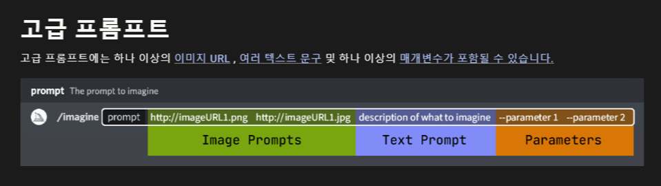 미드저니에 프롬프트를 입력하는 방식은 딱히 정해진 방법은 없다. 미드저니 공식 블로그에서는 프롬프트를 입력할 때 가능한 문장 보다는 단어를 중심으로 기술하라고 추천하고 있다. 그리고 이미지 첨부, 텍스트 프롬프트, 파라미터 3가지를 함께 사용할 수 있다는 기준 정도만 공지하고 있다. 다른 프롬프트에 대한 사용법은 사용자가 다양한 테스트 과정을 통해서 자기만의 답을 만들어 간다고 할 수 있을 것이다.