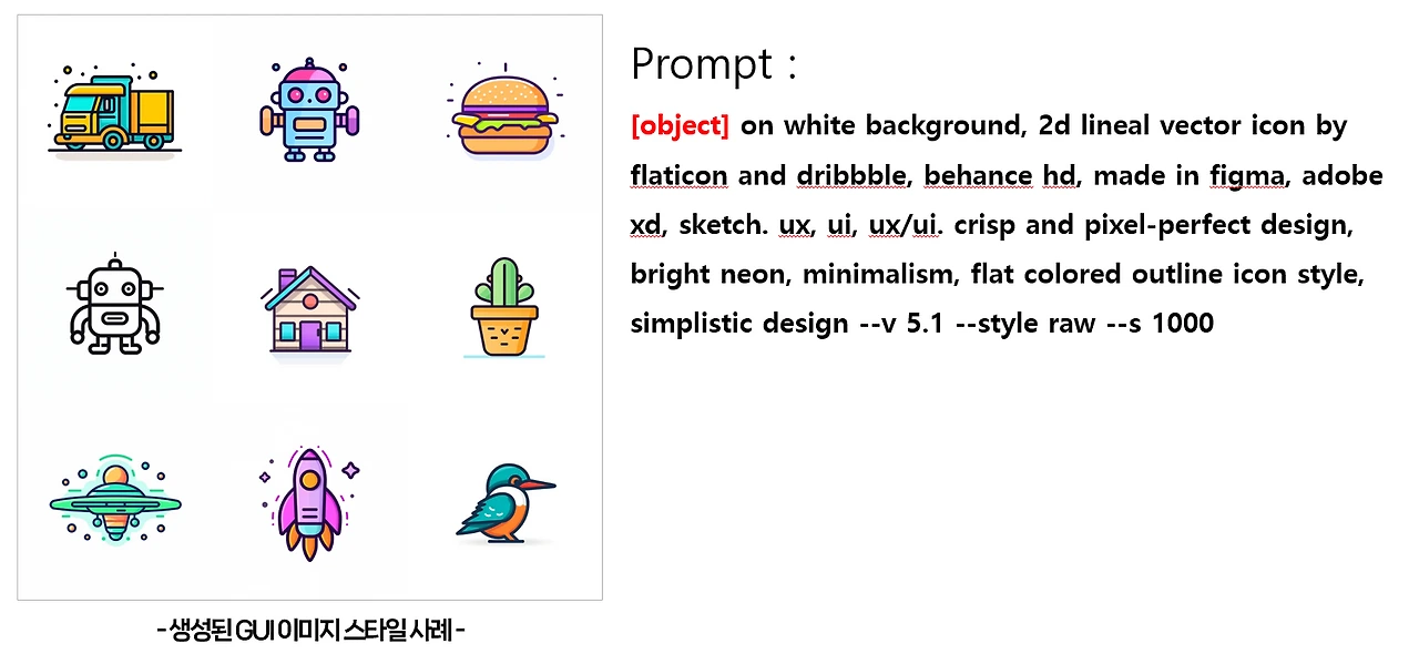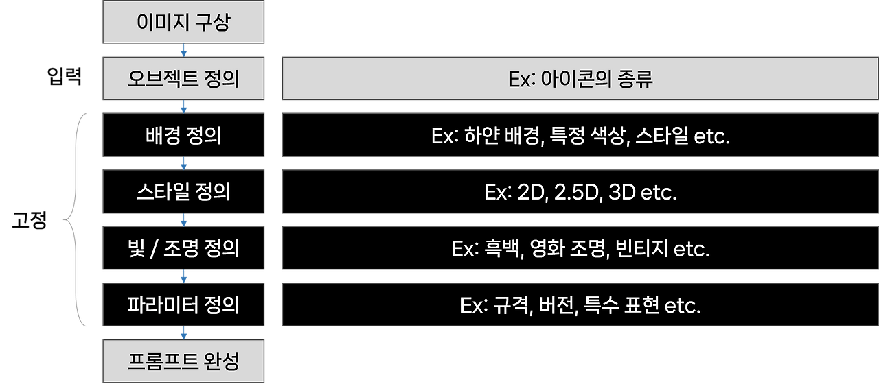 필자 같은 경우도 첨부된 이미지와 같이 간단한 체계를 만들어 보았다. 예를 들어 아이콘을 만든다고 하면 아이콘의 종류만 구분해서 입력할 수 있도록 하고, 아이콘의 스타일과 다른 부분들은 프롬프트를 고정해서 동일하게 생성될 수 있도록 한 것이다.