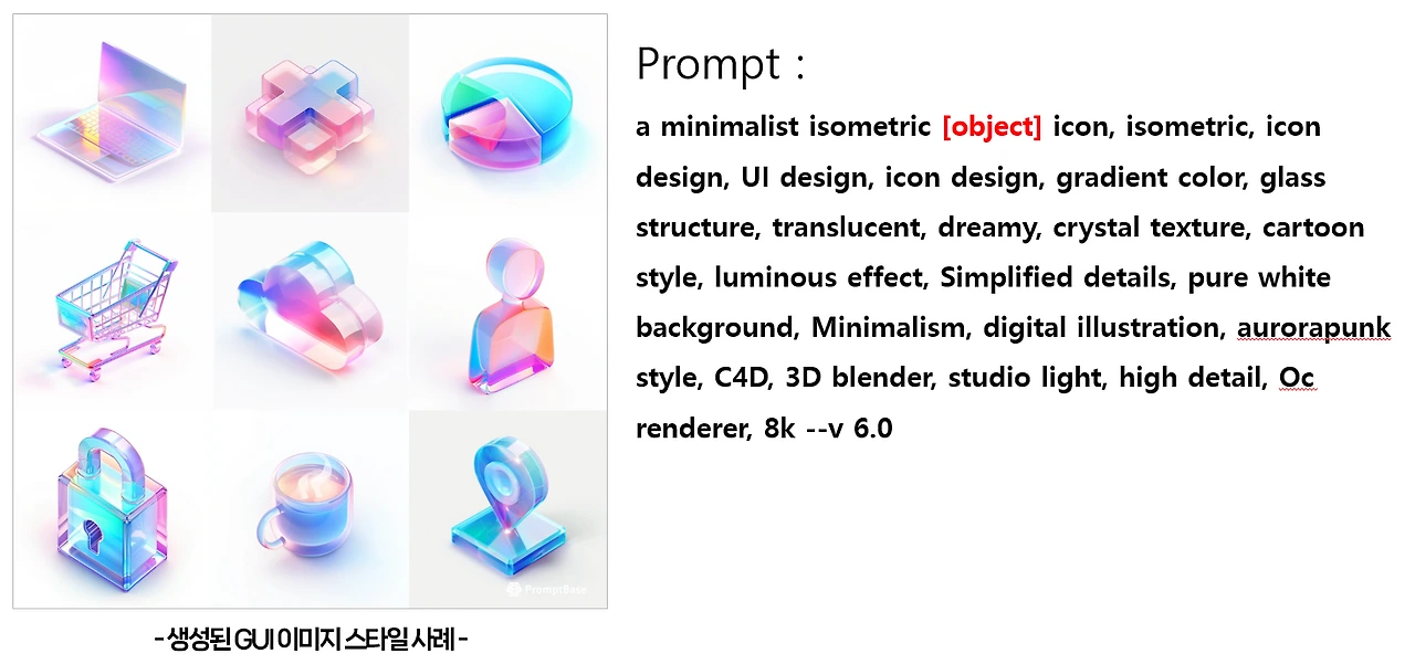 디자인 과정의 혁신적인 변화라고 할 수 있다. 예전에는 이런 3D 느낌의 아이콘을 만들기 위해서는 디자이너가 2D 도구를 아주 잘 다루어서 예쁘게 그리거나, 3D 도구로 랜더링 작업을 해서 만들어야 했다. 그런데 프롬프트 하나만 셋팅이 되면 이제 단어 하나만 바꿔서 미드저니와 같은 이미지 생성 AI에서 1분 안에 결과물을 생성해 볼 수 있다.