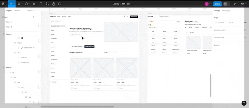 다른 와이어프레임 도구와 달리 UX 파일럿 와이어프레머는 디자인 프롬프트에 맞게 미리 정의된 구조 내에서 단순히 컴포넌트를 교체하는 것 이상의 기능을 제공합니다. 실제로 생성된 와이어프레임의 구조나 레이아웃에는 제한이 없습니다. 따라서 기본 디자인 콘셉트가 있든, 즉흥적인 아이디어가 있든 상관없이 비전에 완벽하게 부합하는 와이어프레임을 얻을 수 있습니다. 가장 좋은 점은 이 모든 작업을 Figma 디자인 파일에서 바로 수행할 수 있다는 점입니다.