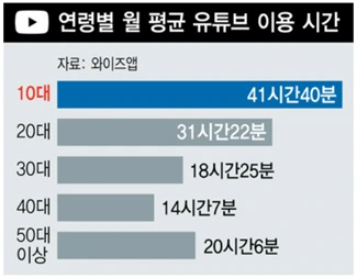 '와이즈앱'에서 2019년 공개한 유튜브 관련 분석 자료를 보면, 2019년 8월 한 달 동안 한국인들은 유튜브를 460억분 사용한 것으로 조사가 되었는데 이는 모든 앱 중 가장 높은 순위였다. 2위를 차지한 앱이 220억분으로 카카오톡이었는데, 전 국민의 소통 채널인 카카오톡 보다도 더 많은 시간 사용한다는 것은 유튜브가 얼마나 사람들의 눈과 귀를 차지하고 있는지 짐작하게 한다. 2018년 8월과 비교했을 때, 38% 증가한 수치로 유튜브 사용량은 매년 지속적으로 성장하고 있다. 특별히 모든 연령대 중에서 10대와 20대 사용자들의 사용시간이 가장 많았는데, 이것은 동영상을 통한 정보 및 콘텐츠 소비 행태가 앞으로도 더 강화될 것을 보여주는 수치라고 할 수 있을 것이다.