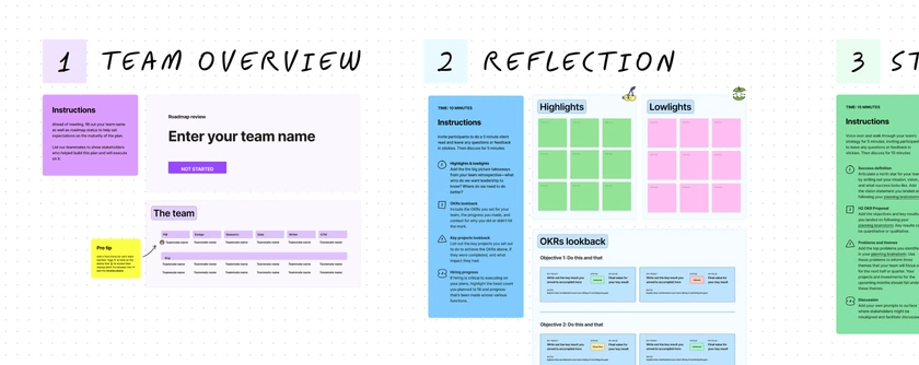 FigJam에는 300개 이상의 사전 제작된 템플릿이 있어 브레인스토밍 세션을 효율적으로 시작할 수 있다. 예를 들어 프로젝트 킥오프 템플릿, 마인드맵 템플릿, SWOT 분석 템플릿 등 다양한 상황별 보드 레이아웃을 불러와서 곧바로 아이디어를 적어나갈 수 있다. 또한 투표(Voting) 위젯이나 타이머(Timer) 위젯 같은 도구를 활용하면 짧은 시간 내 아이디어를 모으고 우선순위를 정하는 워크숍도 FigJam 안에서 진행할 수 있다. 이를 통해 오프라인 회의에서 포스트잇을 나누고 점수를 매기던 과정을 온라인으로 똑같이 재현할 수 있다.