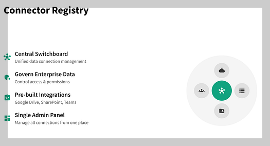 AI 에이전트가 단순한 장난감을 넘어 진정한 비즈니스 도구로 거듭나기 위해서는 기업의 가장 중요한 자산인 ‘데이터’에 접근하고 이를 활용할 수 있어야 한다. ‘커넥터 레지스트리(Connector Registry)’는 바로 이 과제를 해결하기 위한 안전하고 통제된 관문이다. 이는 관리자가 조직 내에서 AI 에이전트가 어떤 데이터 소스와 도구에 연결될 수 있는지를 중앙에서 통합 관리하는 허브 역할을 수행한다.