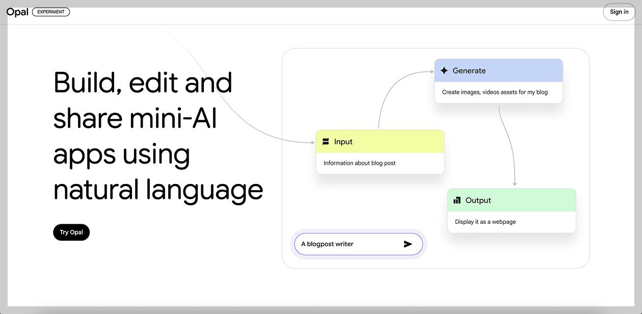 Google Opal은 이러한 '제로 코드' 시대의 대표적인 실험 플랫폼이다. Opal은 코딩 지식 없이도 누구나 AI 기반의 미니 앱을 신속하게 구축하고 배포할 수 있도록 설계된 노 코드 AI 앱 빌더다. Opal의 목표는 개발자가 아닌 비즈니스 사용자, 교육자, 그리고 아이디어를 빠르게 검증하고 싶은 메이커들에게 이상적인 환경을 제공하는 것이다. 앱 배포에 웹 서버가 필요 없고, 완성된 앱을 즉시 공유하고 게시할 수 있다는 점은 아이디어 검증 주기를 극도로 단축시켜, 기술력보다 아이디어의 신속한 구현 속도가 중요해지는 환경을 조성한다.