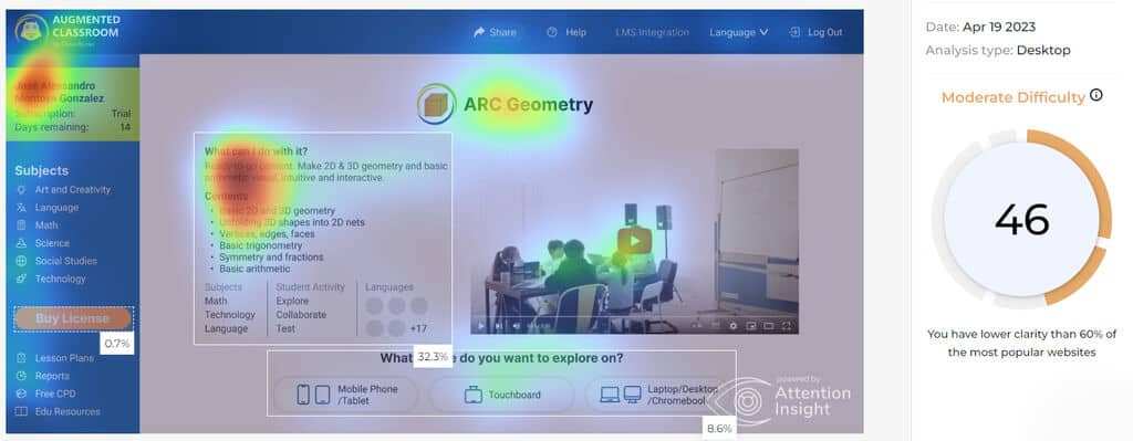 Augmented Classroom은 초기 앱 정보 화면에서 콘텐츠 접근성 문제가 심각했으며, 대부분의 첫 방문자가 핵심 콘텐츠를 찾지 못해 좌절했다. 초기 디자인에 대한 Attention Insight의 분석 결과, 화면 하단의 CTA 버튼들은 주목도가 매우 낮았고, 긴 텍스트 영역에 가장 많은 주목이 집중되는 패턴이 확인되었다. 또한 명확성 점수는 46점으로, 디자인이 보통의 어려움을 유발함을 나타냈다.