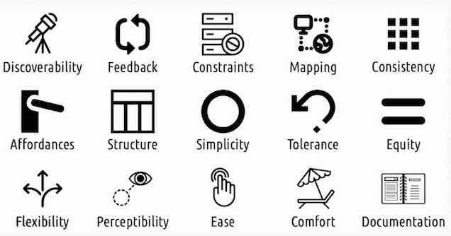 이 책에서 노먼은 사용자 중심 디자인을 실현하기 위한 구체적인 인지적 원칙들을 체계화했다. 첫째는 '어포던스(Affordance, 행동 유도성)'다. 이는 사물의 물리적 속성이 인간에게 어떤 행동을 하도록 유도하는 관계적 특성을 의미한다. 예를 들어, 평평한 판이 붙은 문은 밀도록 유도하고, 둥근 손잡이는 잡고 돌리도록 유도한다. 둘째는 '기표(Signifier)'로, 어포던스가 행동의 가능성을 나타낸다면 기표는 그 행동을 어디서 어떻게 수행해야 하는지를 알려주는 시각적, 청각적 신호다. 셋째는 '매핑(Mapping)'으로, 조작부와 그에 따른 결과 사이의 논리적, 공간적 관계를 뜻한다. 가스레인지의 화구 위치와 조절 손잡이의 위치를 일치시키는 것이 좋은 매핑의 예다.