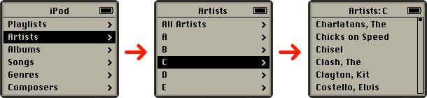 아이팟은 디지털 음악 라이브러리를 탐색하는 논리적 구조에서도 혁신을 이루었다. 수천 곡의 노래를 관리하기 위해 애플은 엄격한 계층 메뉴 구조를 설계했다.