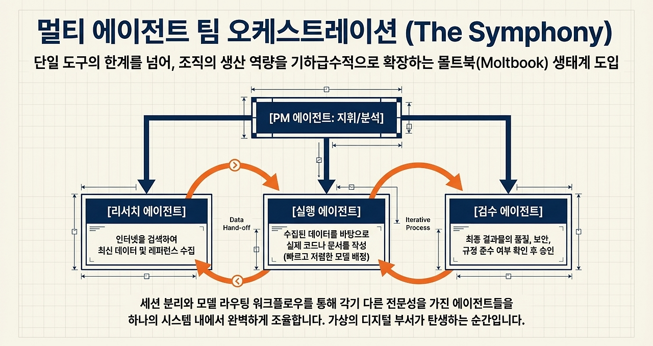 대규모 멀티 에이전트 실험 사례인 몰트북(Moltbook)은 수많은 에이전트가 인간의 개입 없이 서로 소통하며 지식을 공유하고 협력하는 가능성을 보여주었다. 기업 내부에서도 이와 유사한 생태계를 구축하여, 마케팅 에이전트가 콘텐츠를 기획하면 디자인 에이전트가 시각 자료를 생성하고 법무 에이전트가 규정 준수 여부를 검토하는 자동화된 콘텐츠 제작 파이프라인을 운영할 수 있다.
