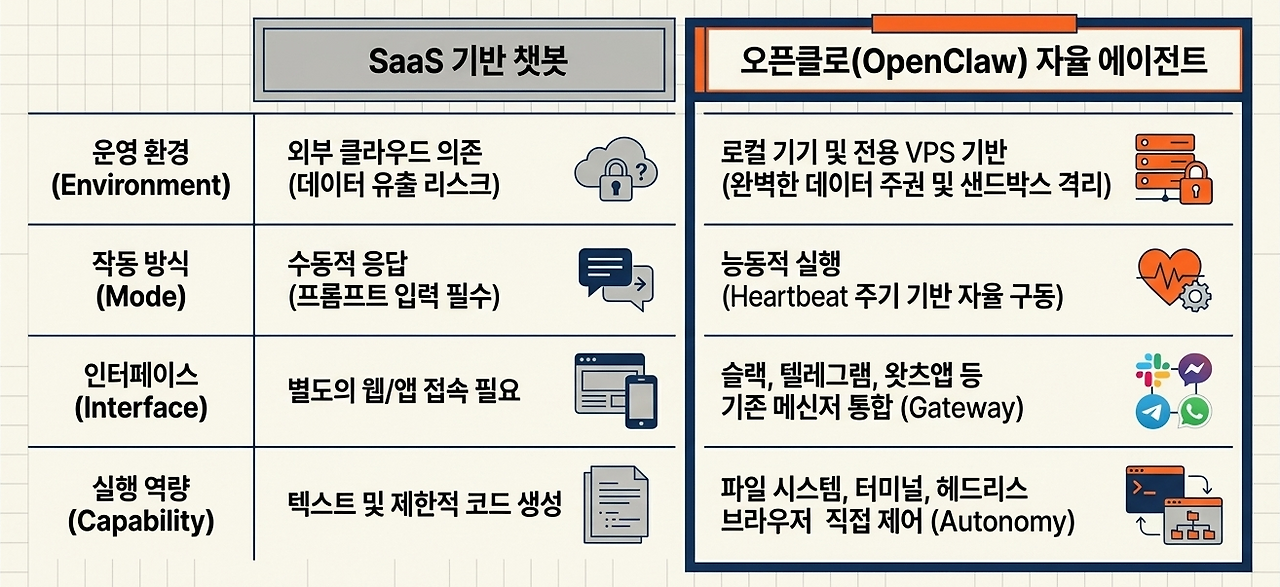 오픈클로의 등장은 기존의 서비스형 소프트웨어(SaaS) 중심 업무 환경에 대한 도전이기도 하다. 데이터를 외부 클라우드에 의존하지 않고 사용자의 로컬 기기나 전용 가상 서버(VPS)에서 직접 구동함으로써 데이터 주권과 프라이버시를 확보하려는 사용자들의 요구가 반영된 결과다. 결과적으로 오픈클로는 인공지능을 단순한 도구가 아닌, 기업의 운영을 책임지는 디지털 인력(AI Staffing)으로 변모시키는 기술적 토대를 마련했다.
