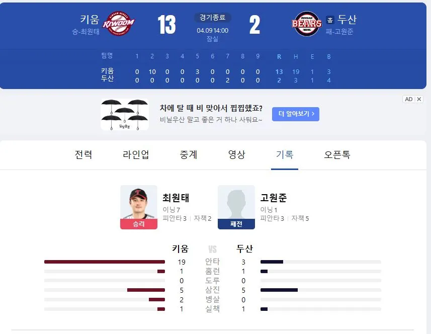 상대는 넥센(현. 키움 히어로즈) 이었다.