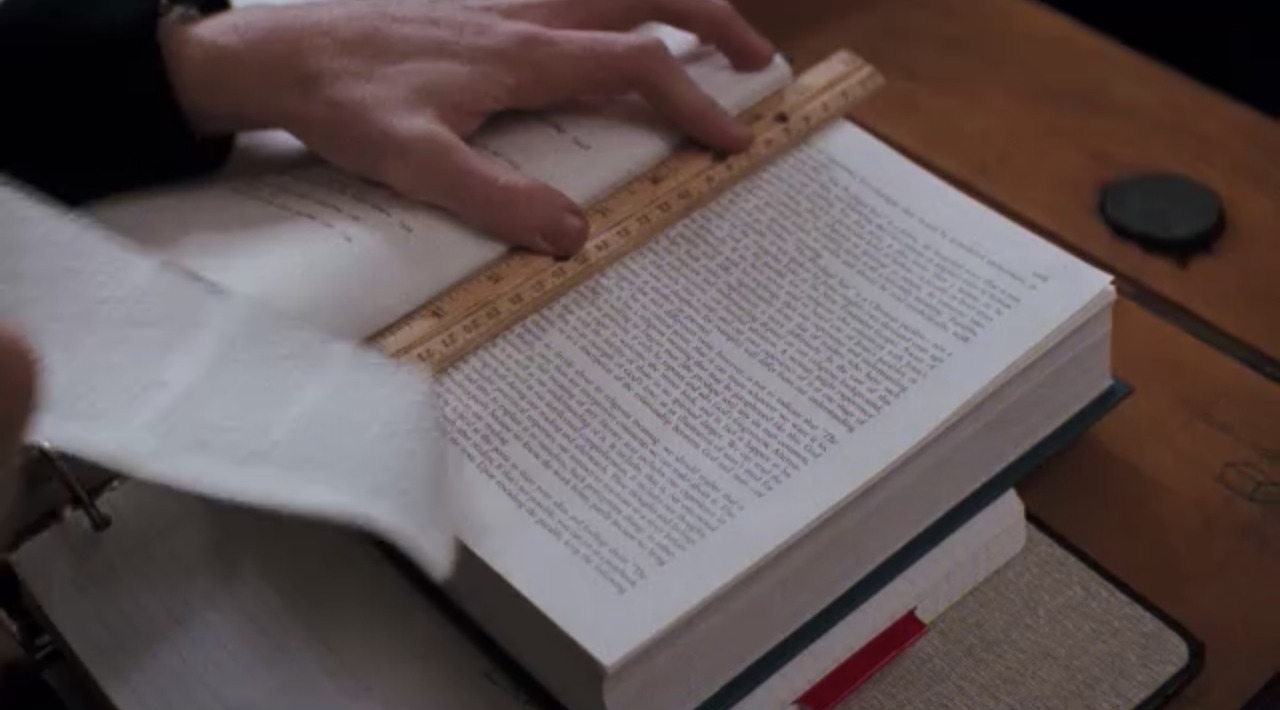또 장면을 잘 관찰해보면 캐머런은 이 페이지를 대표적인 측정 도구인 자를 사용하여 뜯는데 함께 뜯겨 나간 건지 이 때는 또 ‘poetry’가 박힌 페이지가 보이지 않는다.