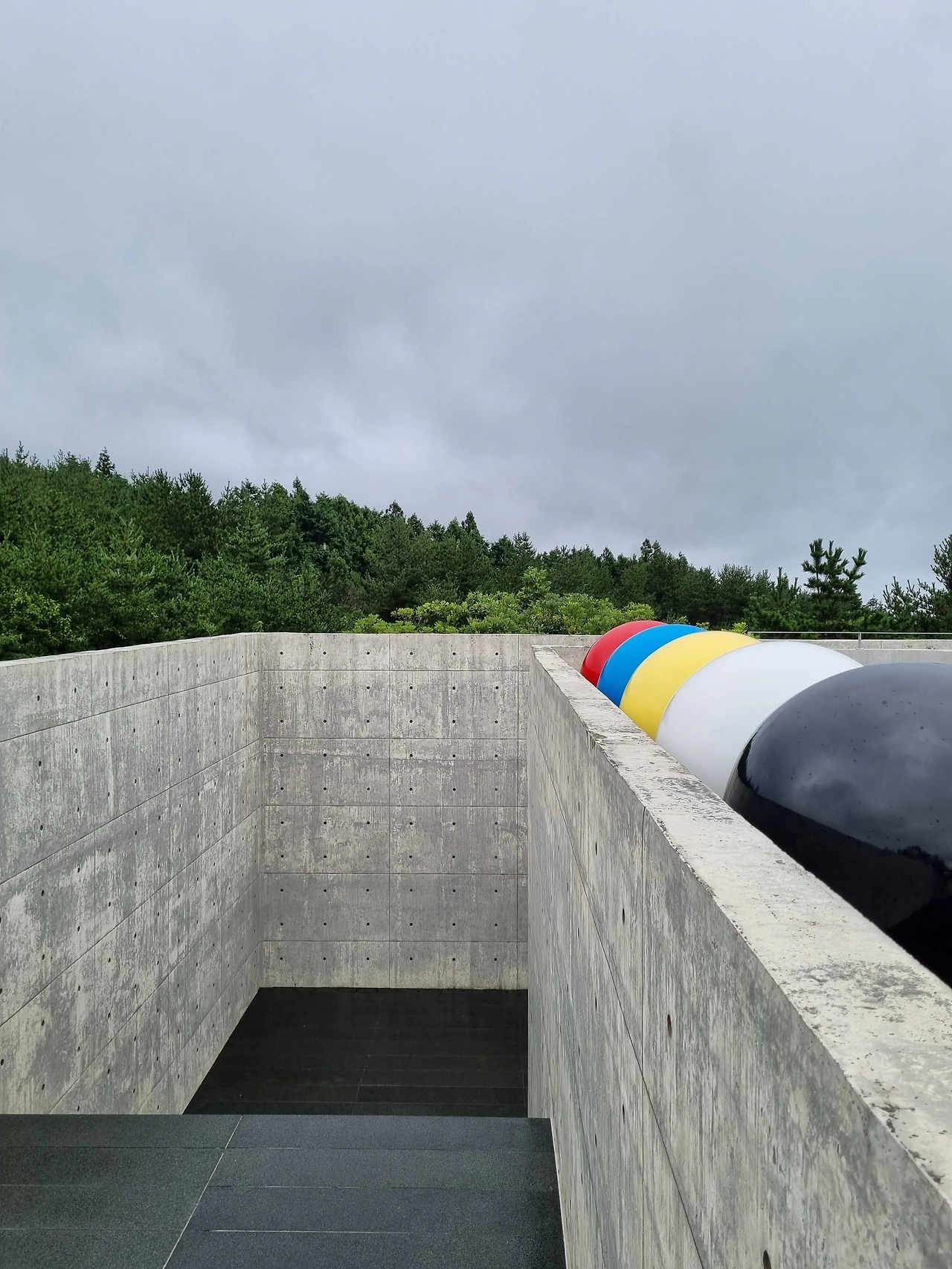 아침을 먹고 나오니, 흐린 하늘에 역시나 비가 내리기 시작했다. 여행 첫날부터 비라니! 그래도 여행은 계속되어야 하기야 '본태박물관'으로 목적지를 정하고, 비 오는 제주도 도로를 달렸다. 박물관에 도착하니 더 거세지는 빗줄기에 우산을 써도 옷이 다 젖을 정도였다. 본태박물관은 세계적인 건축가 '안도 타다오'의 건축물로도 유명한데 심한 빗줄기에 제대로 감상도 못한 채 박물관 안으로 급히 들어와 버렸다. 본태박물관은 다섯 개의 전시관으로 구성되어 있고, 전시관들이 건물 안으로 연결되어 있는 구조가 아니라서 일부 전시관을 이동할 때 외부로 나가야 하는 상황이었다. 덕분에 중간중간 비를 맞긴 했지만, 잠시나마 안도 타다오의 건축물을 밖에서도 감상할 수 있었다.