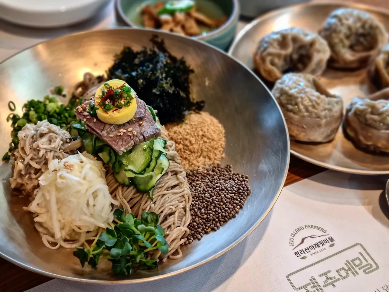 본태박물관을 나온 뒤늦은 점심을 먹으러 갔다. 제주 여행 전에 미리 알아보고 온 메일 전문점 '한라산아래첫마을'로 향했다. 마을 주민들이 직접 재배한 메밀로 만든 100% 메밀면이라고 해서 기대가 됐다. 비비작작면과 메밀만두를 주문해 먹었는데, 예상대로 너무 고소하고 담백한 건강한 맛이었다. 비비작작면은 알록달록 그림 같은 플레이팅에 눈이 즐거웠고, 고소한 들기름 향과 메밀면의 조화가 무한 흡입을 부르는 맛이었다. 한 그릇을 싹싹 비워도 부담 없고, 기분 좋은 맛이었다.