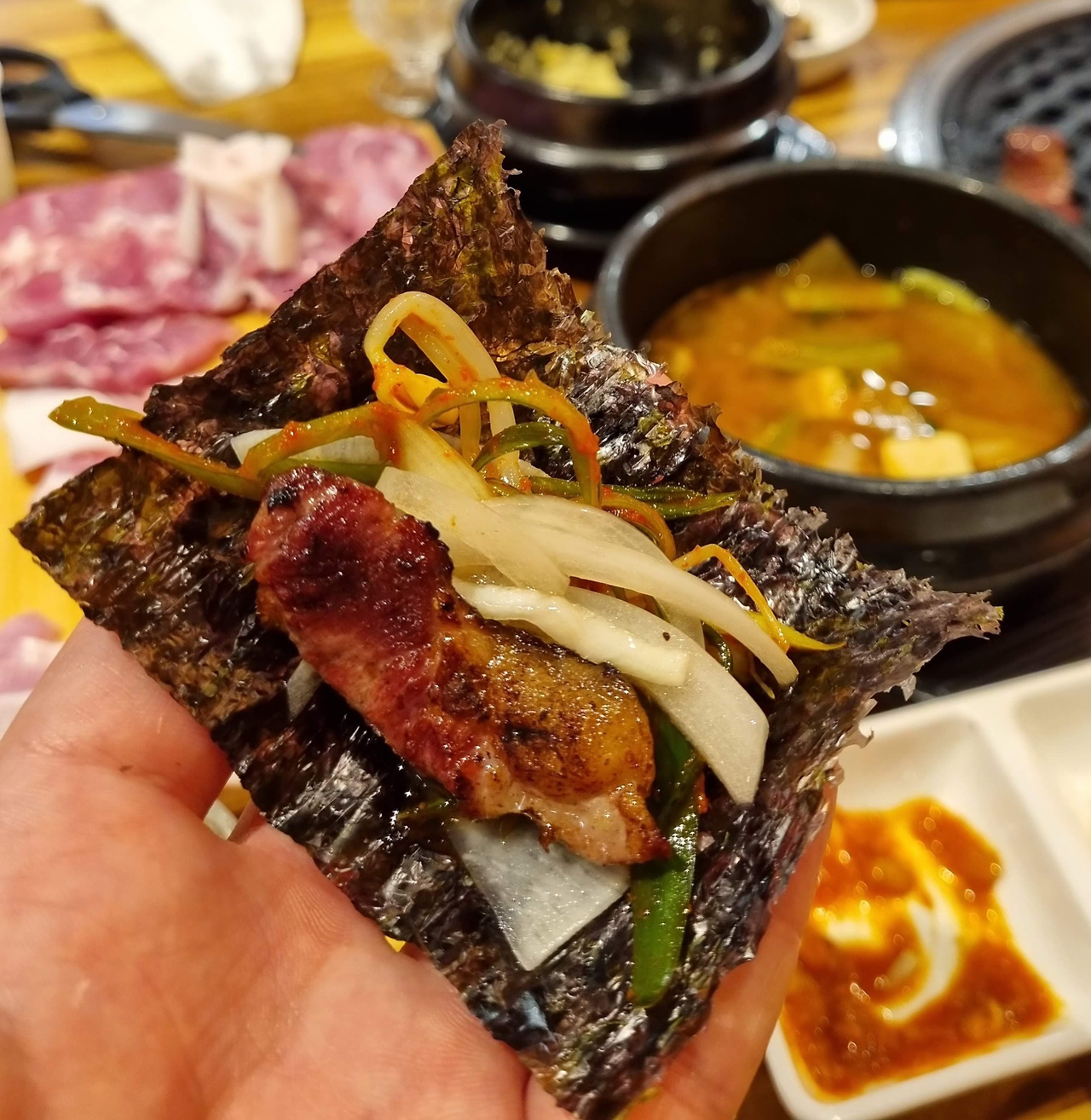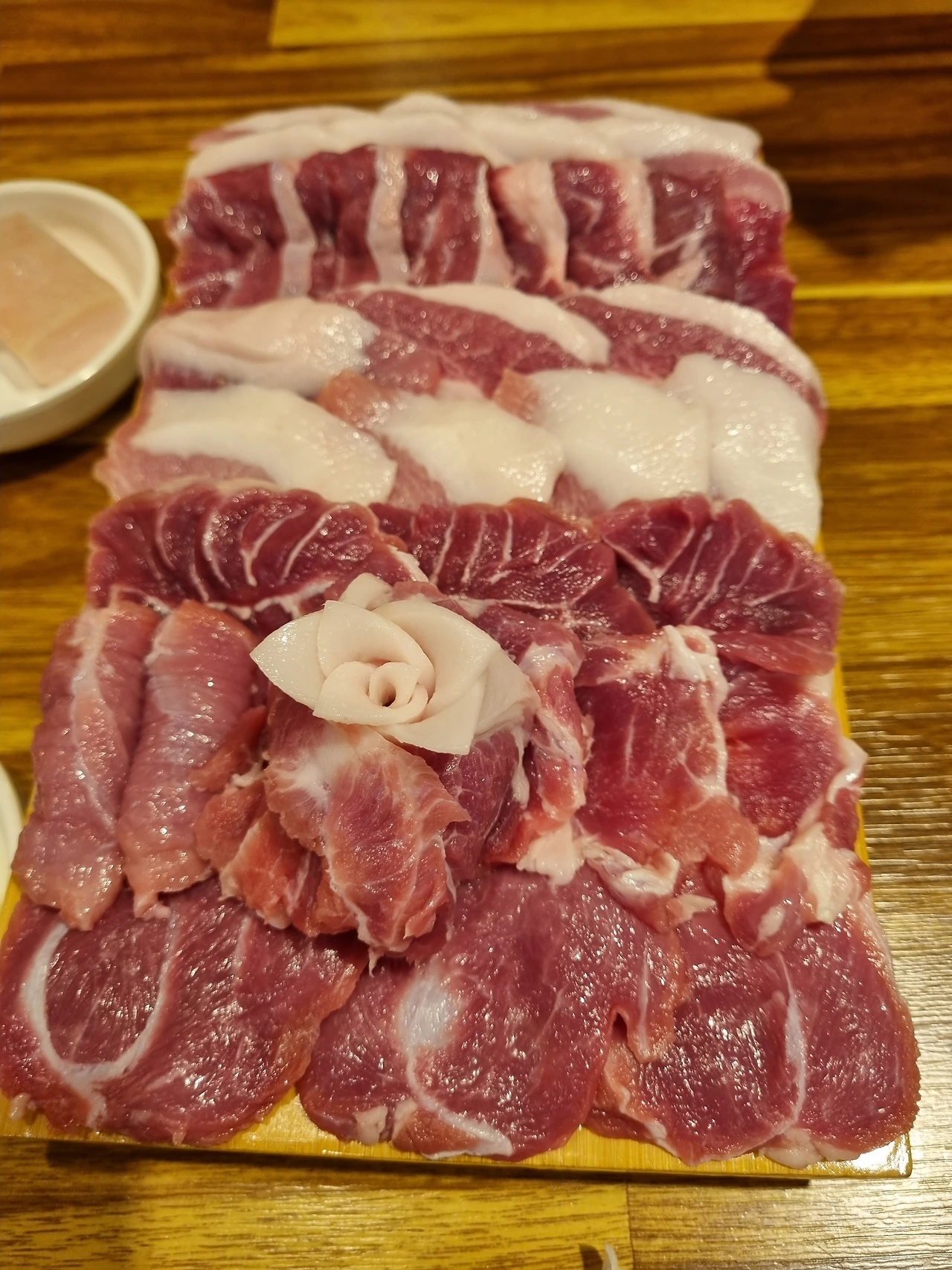 기분 좋게 폭포를 보고 숙소 근처로 돌아와서, 이른 저녁을 먹으러 갔다. 어제 도전했다 실패한 '뽈살집'을 재도전하기로 하고 어제 보다 1시간 빨리 가서 오후 5시부터 줄을 섰다. 약 30분 정도를 대기하다가 드디어 가게로 입성했다. 이 가게는 흑돼지 특수부위를 파는 가게라 일단 특이했고, 직원분이 김에 고기를 싸 먹는 방법을 알려주셨는데 별미였다. 중간중간 서비스도 잘 챙겨주셔서 기분 좋게 먹고 나왔다.