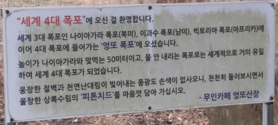 폭포 근처에 있던 <"세계 4대 폭포"에 오신 걸 환영합니다> 라는 표지판을 봤는데, 처음에는 코웃음을 쳤다. 세계 3대 폭포는 워낙 유명하지만, 엉또폭포까지 해서 4대 폭포라니 이거 너무 과장이 심한 거 아닌가?