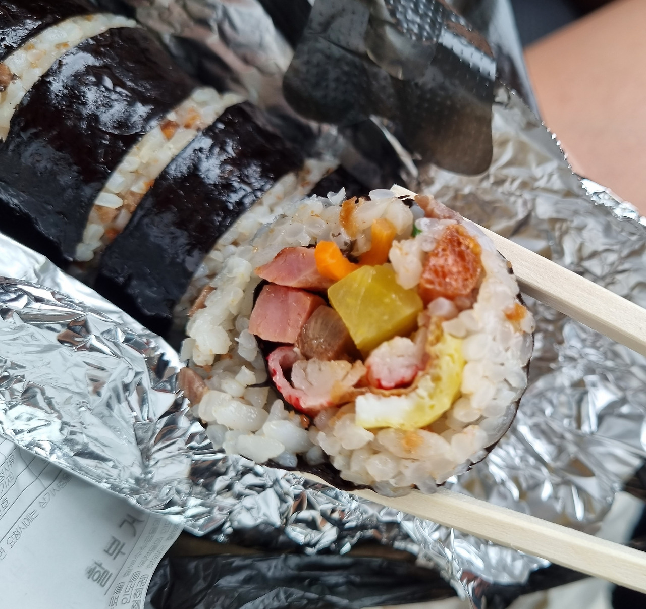 몇 년 전에 처음 먹어보고 이번이 두 번째였는데, 그동안 예약하는 시스템이 바뀌었다. 몇 년 전에는 전화를 수백 통 한 끝에 겨우 예약에 성공했었다. 이번에는 전화예약이 워낙 힘들어서인지 방문예약 시스템으로 바뀌어있었다. 토요일 오후 4시쯤 가게로 직접 방문해서 월요일 10:50 픽업을 예약하고, 시간에 맞춰 김밥을 픽업했다. (일요일은 휴무) 김밥을 픽업하자마자 차 안에서 바로 먹었다. 처음 먹었을 때의 감동이 없으면 어쩌나 걱정했는데, 다행히도 처음 감동 그대로였다. 예약 과정의 수고스러움을 잊게 만드는 맛이다. 내 인생 김밥!!