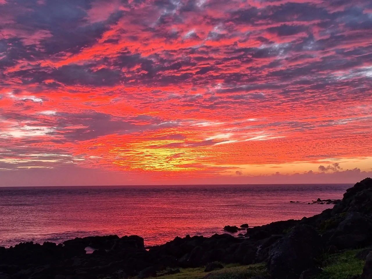 비양도 캠핑의 최대 난코스는 아까 얘기했던 '바람'이다. '아니 바람이 불어봤자 얼마나 불겠어? 여름인데 시원하겠지?' 이 생각은 나의 오산이었다. 바람은 정말 미.친.듯.이 분다. 엄청난 바람에 텐트가 사방으로 펄럭거려 잠을 자는 것은 무리다. 귀마개도 챙겨갔지만, 자연 앞에 인간은 하찮은 존재일 뿐이다. 뜬눈으로 밤을 지새우다시피 하고, 아침에 일출을 보기 위해 5시 반에 일어났다. 차라리 깨어있는 게 낫다. 이미 일출을 보러 나온 사람들이 많았다. 일출이 뜨기 전 하늘과 바다가 온통 새빨갛게 물들었다. 바람을 이겨낸 뒤라 감동은 더 했다. 구름 때문에 완벽한 일출은 못 봤지만, 해뜨기 전의 여명과 그 고요함만으로도 충분히 아름다운 아침이었다.
