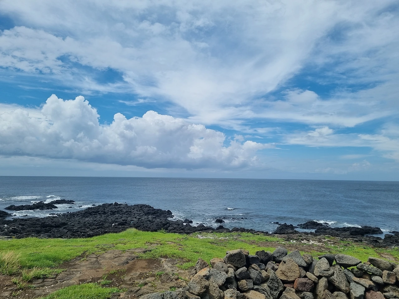 까페를 나와 검멀레해변 쪽으로 이동했다. 예전 우도 여행 때도 이미 본 광경인데 다시 봐도 멋졌다. 까만 해변과 암벽, 대비를 이루는 초록색 풀과 나무들. 보고만 있어도 가슴이 웅장 해지는 건 왜일까?
