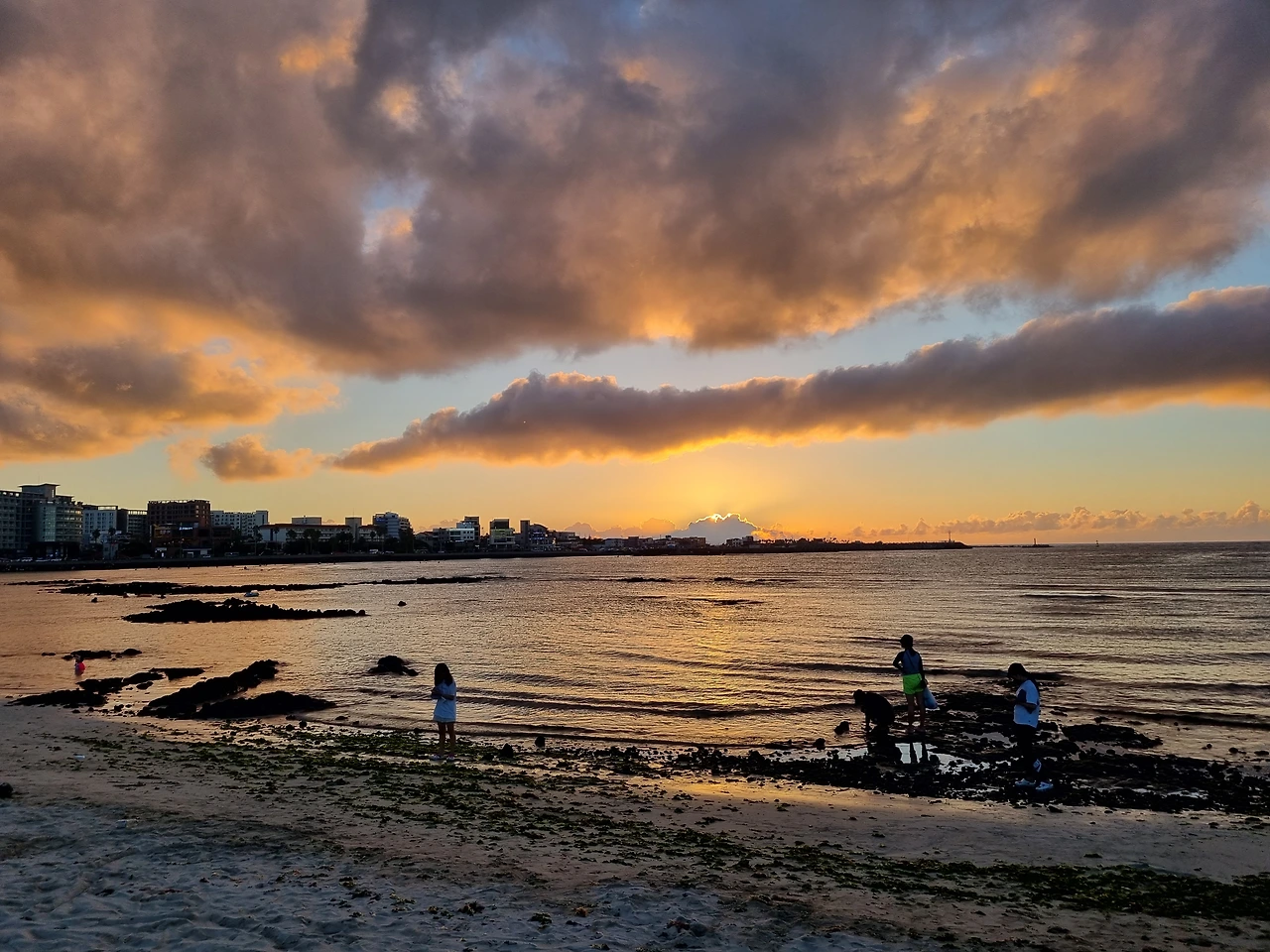물놀이를 다 마치고 숙소로 돌아와 잠시 쉬다가 함덕해수욕장 산책을 했다. 해가 지는 저녁의 함덕해수욕장은 한낮의 소란스러움 대신 조용하고 차분했다. 아름다운 바다 색깔 대신 주황색으로 물들어가는 고요한 바다를 잠시 감상했다.