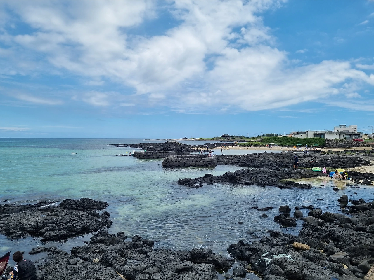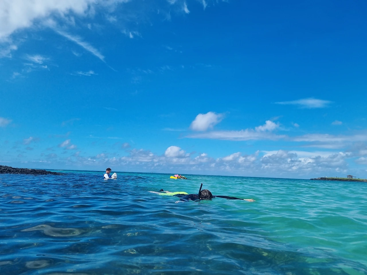 해변에 도착하자마자 바닷속으로 입수했다. 해변에서 조금 거리가 있는 곳에 큰 바위들과 해초들이 많이 있어서 그쪽으로 헤엄쳐서 스노클링을 했는데, 결과는 대성공적이었다. 바위와 해초 틈 사이로 많은 물고기들을 두 눈으로 실컷 볼 수 있었고, 잠시 물밖에 고개를 내밀고 쉴 때에도 코난해변 주변의 아름다운 풍경 자체로 힐링이 되는 순간이었다. 제주도 바다 색깔이 원래 이렇게 예뻤었나? 감탄하면서 열심히 스노클링하고 잠시 쉬기를 반복했다.
