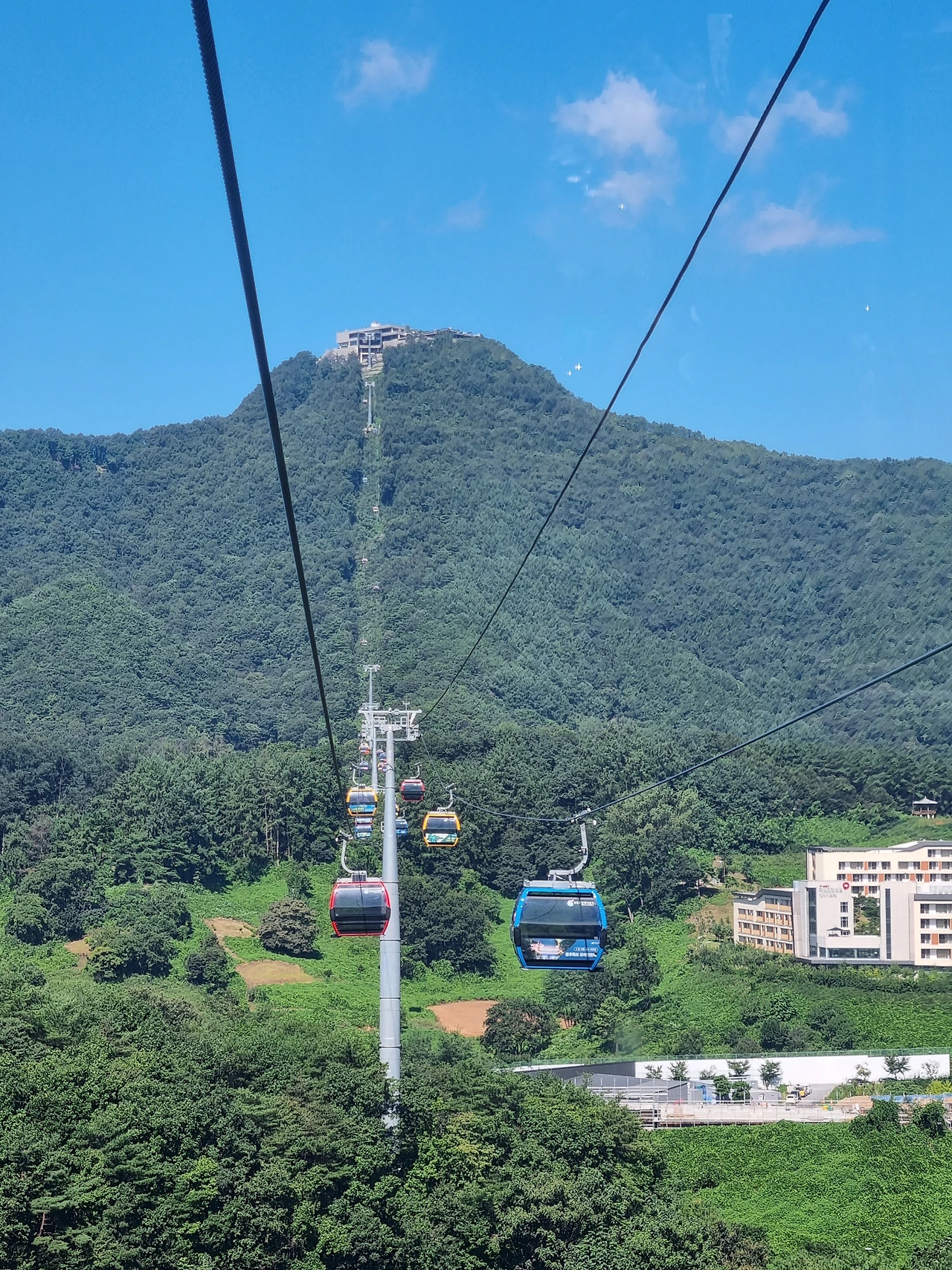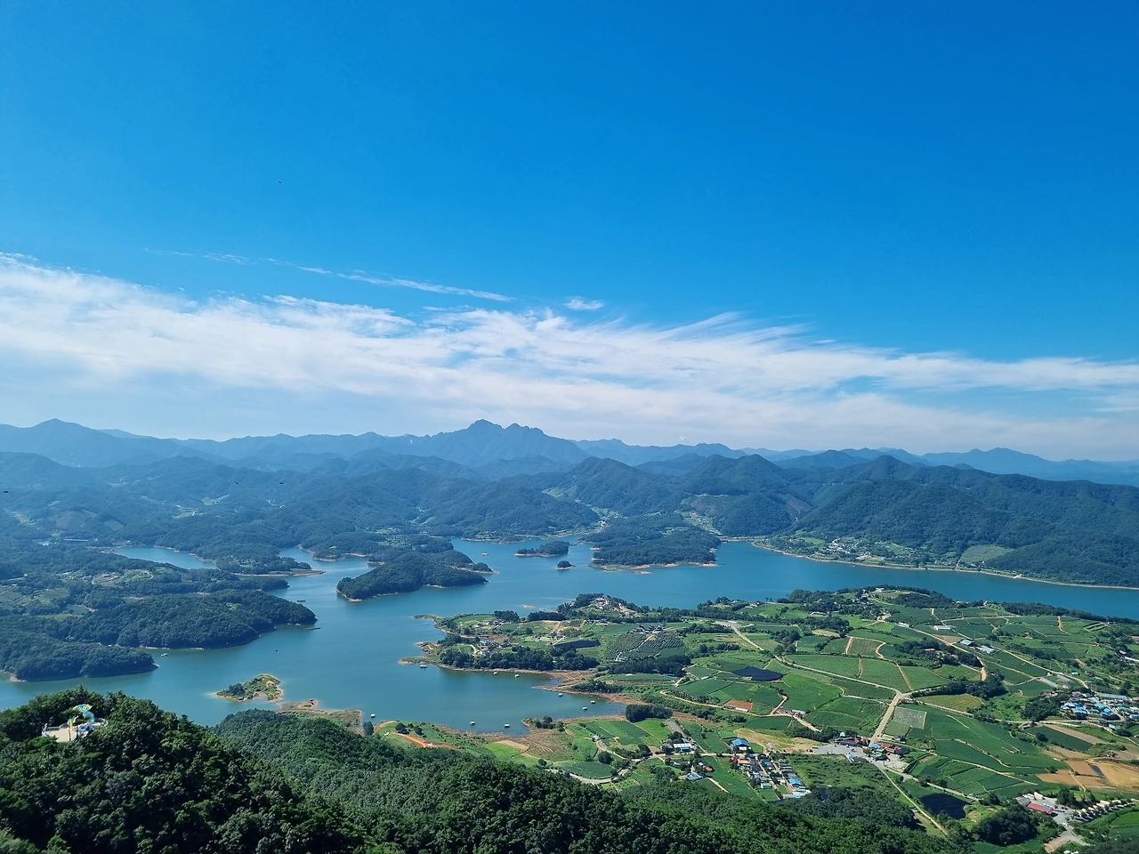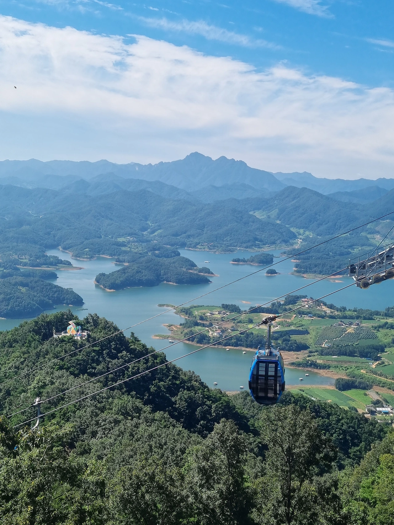 청풍호반 케이블카를 타고 비봉산 정상에 올라 내려다보는 충주호(제천에서는 청풍호라고 부른다고 함)는 정말 환상적인 뷰를 자랑한다. 파란색과 초록색의 올록볼록한 경계선과 높고 낮은 산들이 만들어 내는 다채로움에 눈이 즐겁고, 360도로 둘러싸여 있는 첩첩산들이 이국적인 느낌이 들기도 한다. 여기가 스위스인가? 할 정도로.