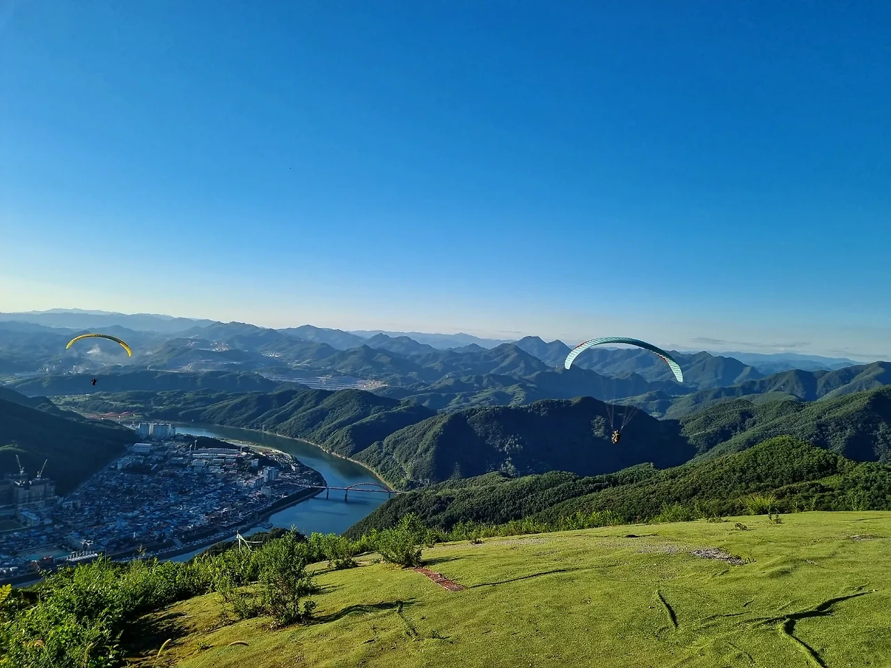 이번 여행에서 제일 좋았던 곳, 양방산전망대! 여기도 올라가는 길이 구불구불하고 험한 편인데, 그 고생스러운 과정을 전부 잊게 만드는 곳이다. 산에서 내려다보니 단양 시내와 시내를 감싸고 있는 충주호(청풍호)가 한눈에 다 들어온다. 양방산 주변이 모두 산으로 둘러싸여 있어서 어딜 봐도 풍경이 환상적이다. 그리고 여기가 패러글라이딩 활공장이라서 패러글라이딩을 하는 과정을 가까이 볼 수 있어서 구경하는 재미가 있었다. 패러글라이딩 하는 사람 중에 어린아이도 있었는데 용기가 대단하다고 생각했다.