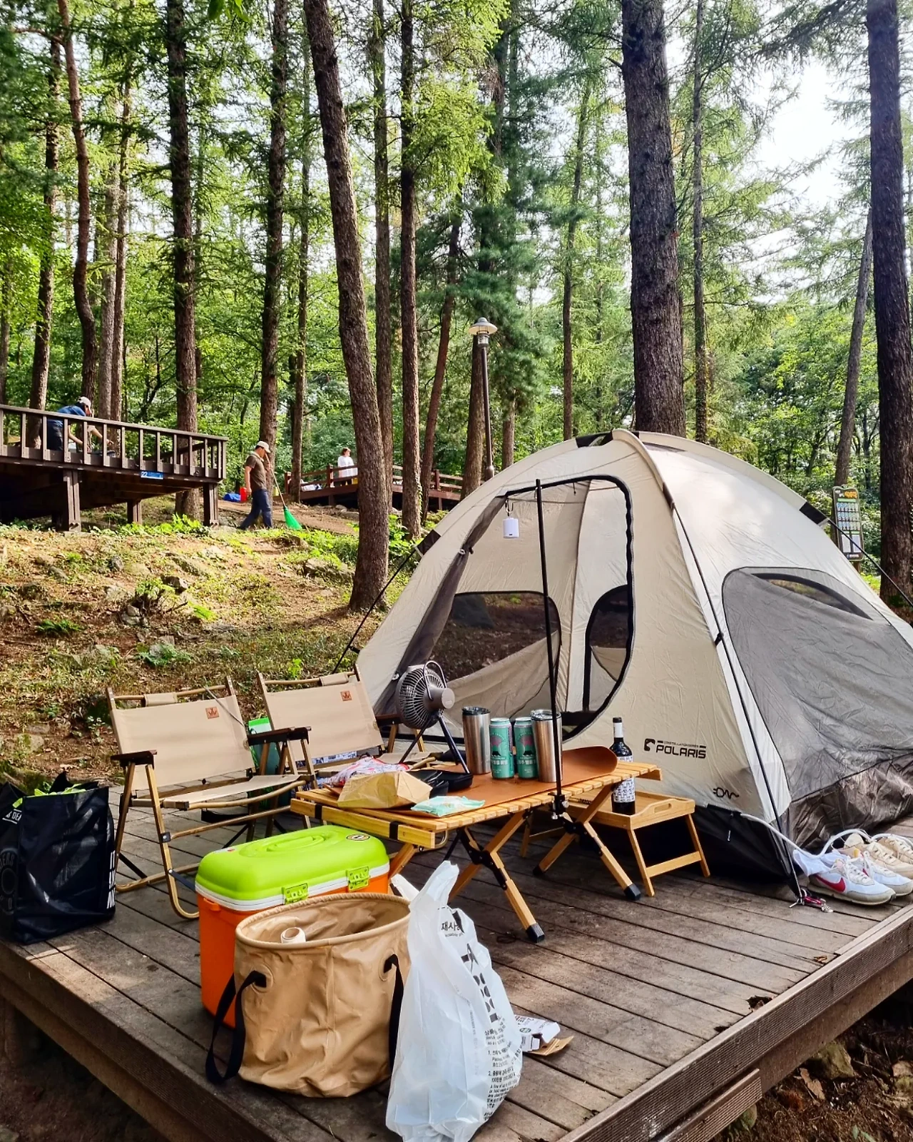 처음으로 텐트를 가져간 캠핑장이다. 자충매트를 빼놓고 오는 실수를 저질렀지만, 근처에서 당근마켓으로 저렴하게 매트를 구하는 기지를 발휘했다. (이 또한 에피소드로 저장) 나무들이 빼곡하게 캠핑장을 감싸고 있어서 진짜 '숲속'야영장을 제대로 느낄 수 있었다. 사이트들이 비교적 넓고 프라이빗해서 좋았다.