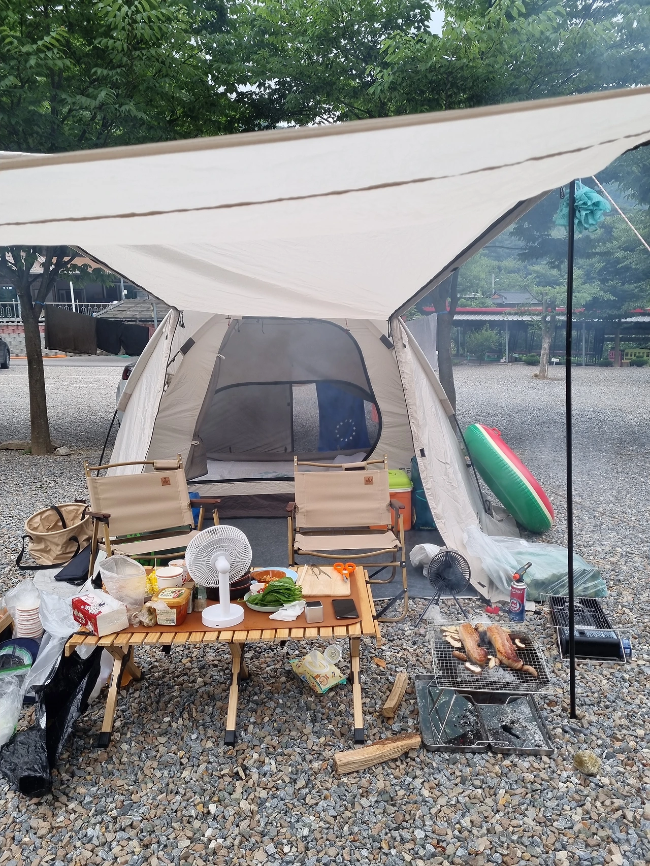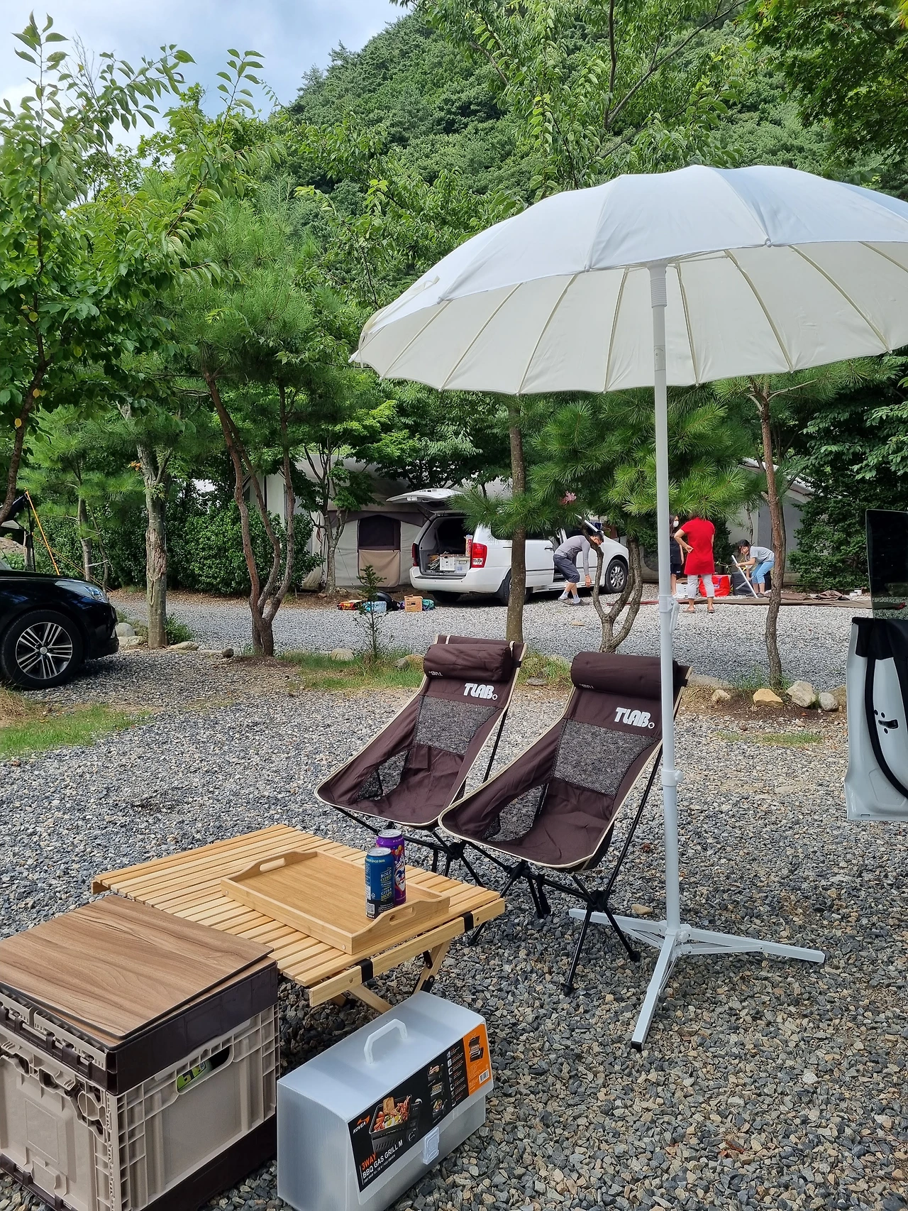 작년 여름휴가 첫날, 덕유산에 갔다가 내려와서 1박을 했다. 이때는 텐트가 없어서 차박을 했는데, 집을 그대로 옮겨놓은 것 같은 캠퍼들의 장비를 보고 눈이 휘둥그레졌다. 우리만 너무 조촐한 것만 같아서 장비 욕심이 마구 샘솟았다. 캠핑장 바로 앞이 계곡이라 메리트가 있는 곳!