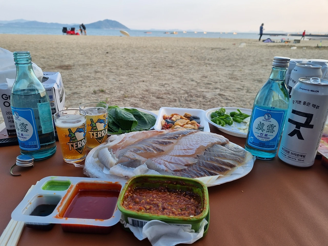 이런 뷰에 무료캠핑장이라니? 말도 안 된다는 생각의 초보 캠린이는 그저 행복할 뿐이었다. 근처에 회센터가 있어서 봄 도다리와 멍게(서비스)를 포장해서 맛있게 먹었다. 바다 뷰에 소맥을 한잔(?)하고, 불멍까지 즐기면서 행복감에 만취했다. 아침에 텐트를 열면, 파란 바다가 바로 보이는 미친 풍경을 가진 캠핑장이다. 보성에는 녹차밭만 있는 게 아니고 아름다운 바다도 있다.