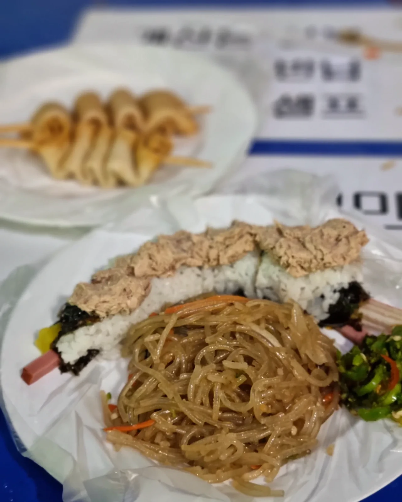 육회 가게에서 나와서 2차로 누드김밥을 먹으러 갔다. 육회를 먹으러 가기 전 원조누드김밥 가게를 먼저 들렀는데, 줄이 너무 길어 포기하고, 육회를 먹고 나서 재도전했다. 이번에도 줄은 길었지만 기다려보기로 했다. 사장님의 손이 너무 빠른 덕분에 줄은 생각보다 금방 줄었다. 세트메뉴(누드김밥+잡채+어묵2개가 단돈 4천원)를 하나 시켜 남편과 나눠먹었다. 푸짐한 양에 소박한 맛까지!! 완벽한 4천 원이었다.