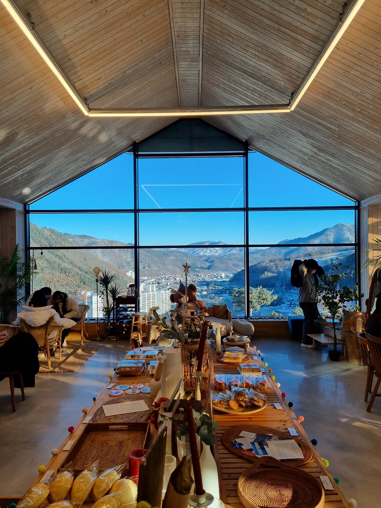 정선에 숙소를 잡아 이동하는 중에 태백에 잠깐 들러 목장에 있는 카페에 갔다. 높은 지대에 위치한 목장에서는 태백 시내가 한눈에 내려다 보였다. 밖은 차갑고 바람이 쌩쌩 부는데, 따뜻한 카페 안에서 옹기종기 마치 장난감 모형 같은 태백 시내를 내려다보고 있자니, 걱정도 추위도 딴 세상 얘기 같다.