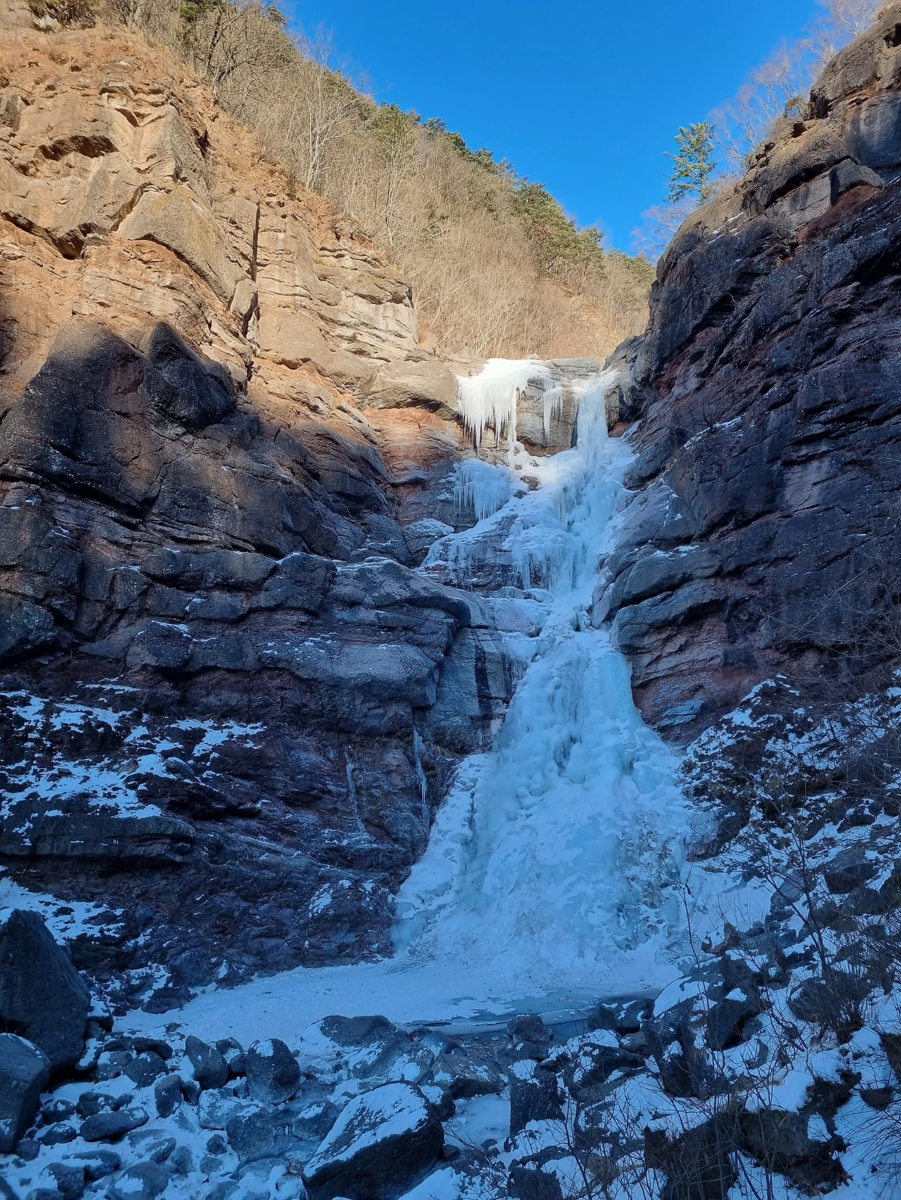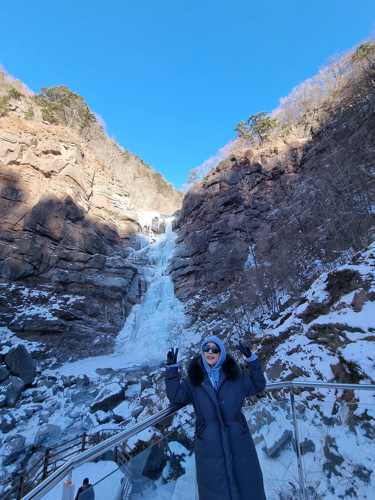 점심을 먹고 근처 '미인폭포'로 향했다. SNS에서 삼척에 갈만한 곳을 검색하다가 아름답게 얼어붙은 미인폭포사진을 보고 반해버렸다. 추운 날씨였지만, 폭포까지 그렇게 오래 걸리지 않는다고 해서 도전해 봤다. 주차장에 차를 대고 폭포까지 걸어가는데 멀지 않은 거리였지만, 너무 추운 날씨와 눈이 내린 탓에 발이 시려 힘들었다. 힘든 것도 잠시, 웅장하게 얼어붙은 폭포를 보면서 그래도 잘 참고 온 것이 다행이었다. 겨울의 폭포는 시간이 멈춰버린 듯한 착각과 위압감을 느끼게 했지만, 시리도록 아름다운 광경이기도 했다.