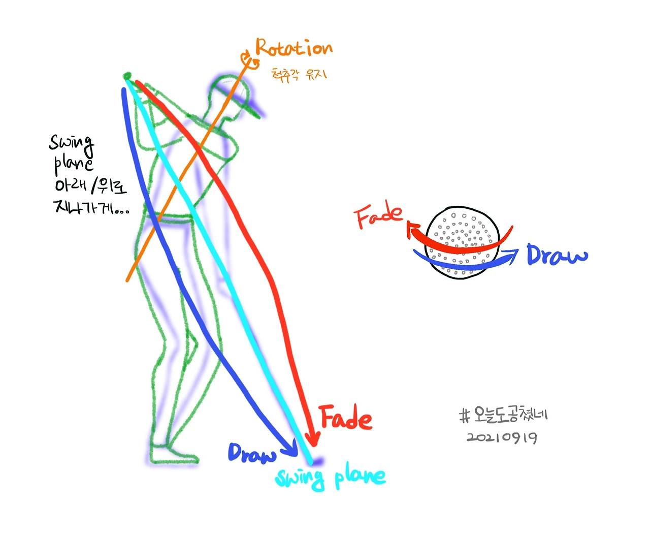 지금까지 나는 대략 서너 가지의 다른 방식의 구질 컨트롤 방법을 연습하고 시도해 봤다. 손목을 활용해 보기도 하고, 하체/상체 타이밍을 조작해 보기도 하고, 공의 위치를 바꿔보기도 하고, 스탠스를 바꿔보기도 했는데, 다 그 나름대로의 실패 요인들이 많이 있었고 오늘은 가장 성공적이었던 스윙 궤도로 컨트롤하는 방법을 얘기해 보려고 한다.