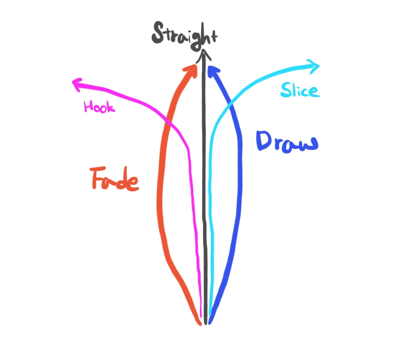 샷의 구질은 스트레이트, 드로우, 페이드, 훅, 슬라이스로 나뉜다. 각 구질을 높이 별로 로우, 미드, 하이, 이렇게 3가지로 다시 나누기도 하지만 좌우 변화만 봤을 땐 위 5가지로 생각하면 된다. 아래는 각 구질의 모양이다.