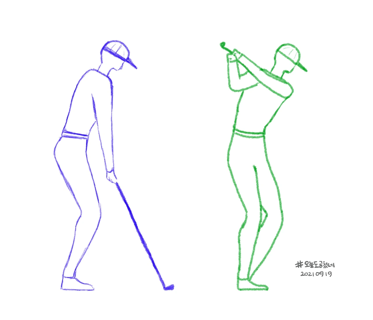 왼쪽 파란색 그림은 어드레스, 오른쪽 초록색 그림은 백스윙 탑 순간이다. 어드레스 때부터 백스윙 탑 까지 올라가면서 클럽이 지나간 궤도가 있을 것이고 그 궤도가 만들어 낸 단면을 스윙 플레인이라고 해보자. 정상적인 예쁜 백스윙을 했다고 가정하고 이 스윙 플레인은 어드레스 시의 클럽 헤드 위치와 백스윙 탑에서의 클럽 헤드 위치를 연결 해 놓은 선이라고 생각해보자.
