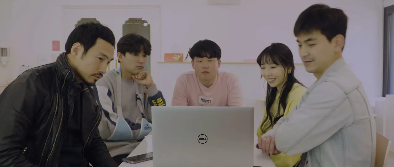 태풍, 덕재, 이현, 지영, 덕희 방금 찍은 거를 보고 있다. 다들 매우 진지하다.