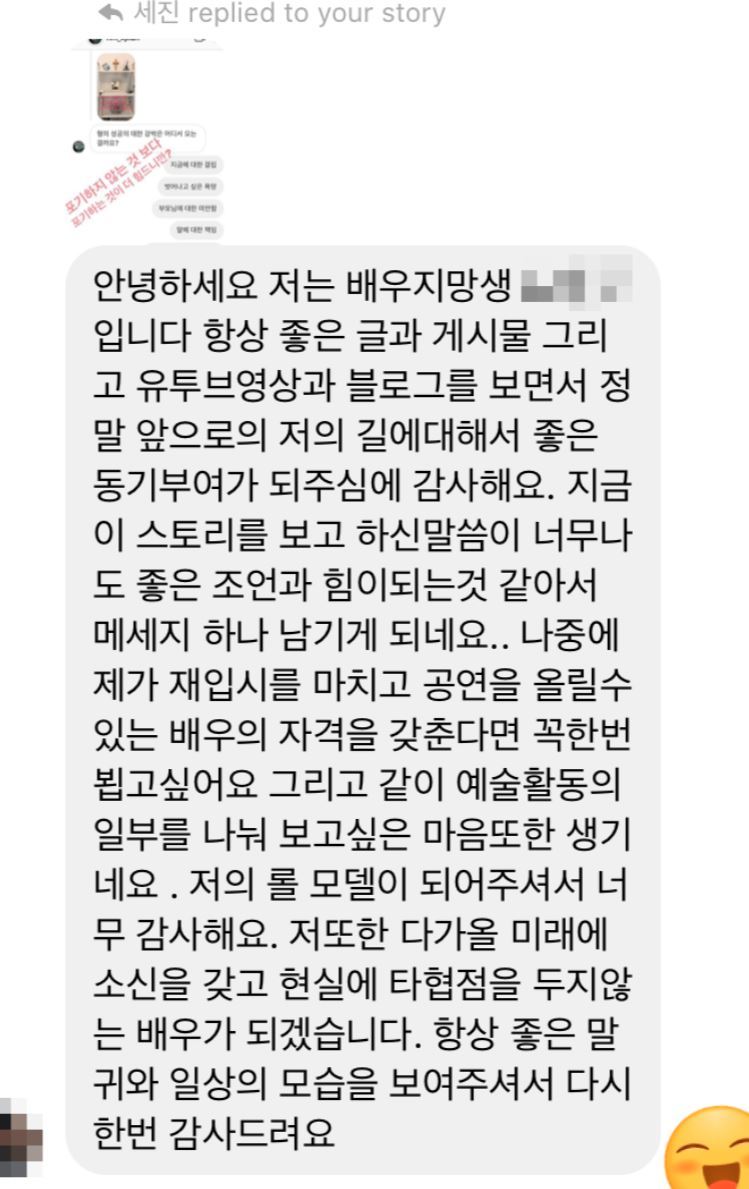 모르는 배우 지망생에게 DM을 받았다. 나의 글들과 피드를 보며 좋은 영향을 받았다는 것이다. 그 쪽지를 받고 나 또한 많은 위로가 되었다. 그리고 우리 작품이 ‘한 명이라도 이런 힘과 좋은 영향을 미칠 수 있으면 된다.’ 하고 생각했다.