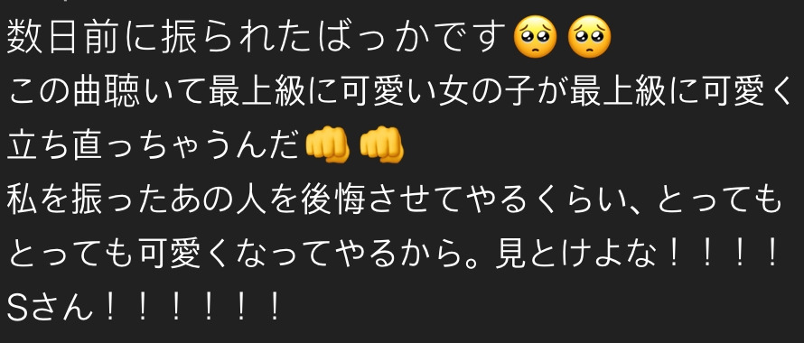 며칠 전에 차였다.. 이 노래를 듣고 최상급 귀여운 소녀가 될 테다! 나를 찬 사람을 후회하게 만들어줄 정도로 매우 매우 귀여워져 줄 테니. 봐라 S군!!!