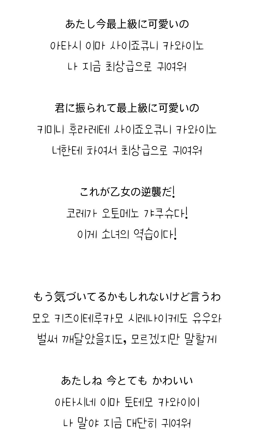 실연 노래를 들으며 울고 또 울고 반복 중인데 이 곡을 듣고 구원받았다고 한다. 네가 시작한 사랑에 정말 어색한 사요나라였어, 아직도 사랑하고 힘들지만, 절대 절대적으로 행복해진다!! 1번으로 귀여워질 테니까 봐!