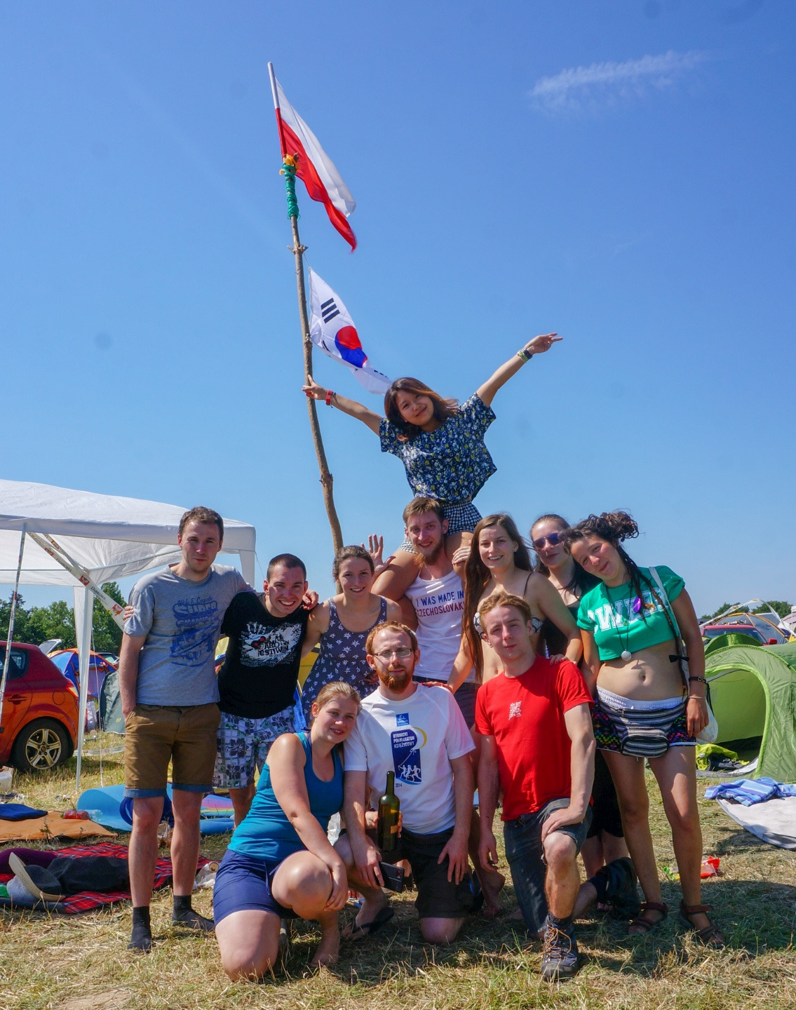 페스티벌 첫날, 나와 세명의 친구들 리암, 셀린, 마틴은 어디에 자리를 잡으면 좋을지 고민하던 중, 유쾌한 폴란드인 무리를 만나게 되어 함께 어울리기로 했다. 높이가 3m쯤 되는 나무 막대에는 폴란드 국기가 걸려있었는데 그 옆에 우리가 가져온 텐트를 설치하고, 텐트 안에 짐을 정리해두고 막 밖으로 나오던 참이었다. 둥글게 늘어선 텐트 앞 잔디에 자리를 깔고 음주를 즐기던 폴란드인 도미니카가 내 가방 앞주머니에 있던 태극기를 가리키더니 물었다.