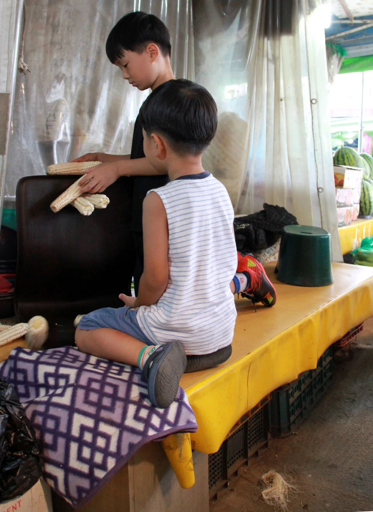 야채시장 중앙시장 쪽을 통과하는데 애기들이 옥수수 쌓기 놀이에 한창이다. 애들에게 끌려서 안으로 들어갔다. 40년째 과일가게를 하고 있는 형우상회 주인아저씨는, 이제 복개천이 되면서 인생의 진로를 고심하고 있다. 가게 주인도 아니어서 보상금이라야 이사비용 정도라고 한다.