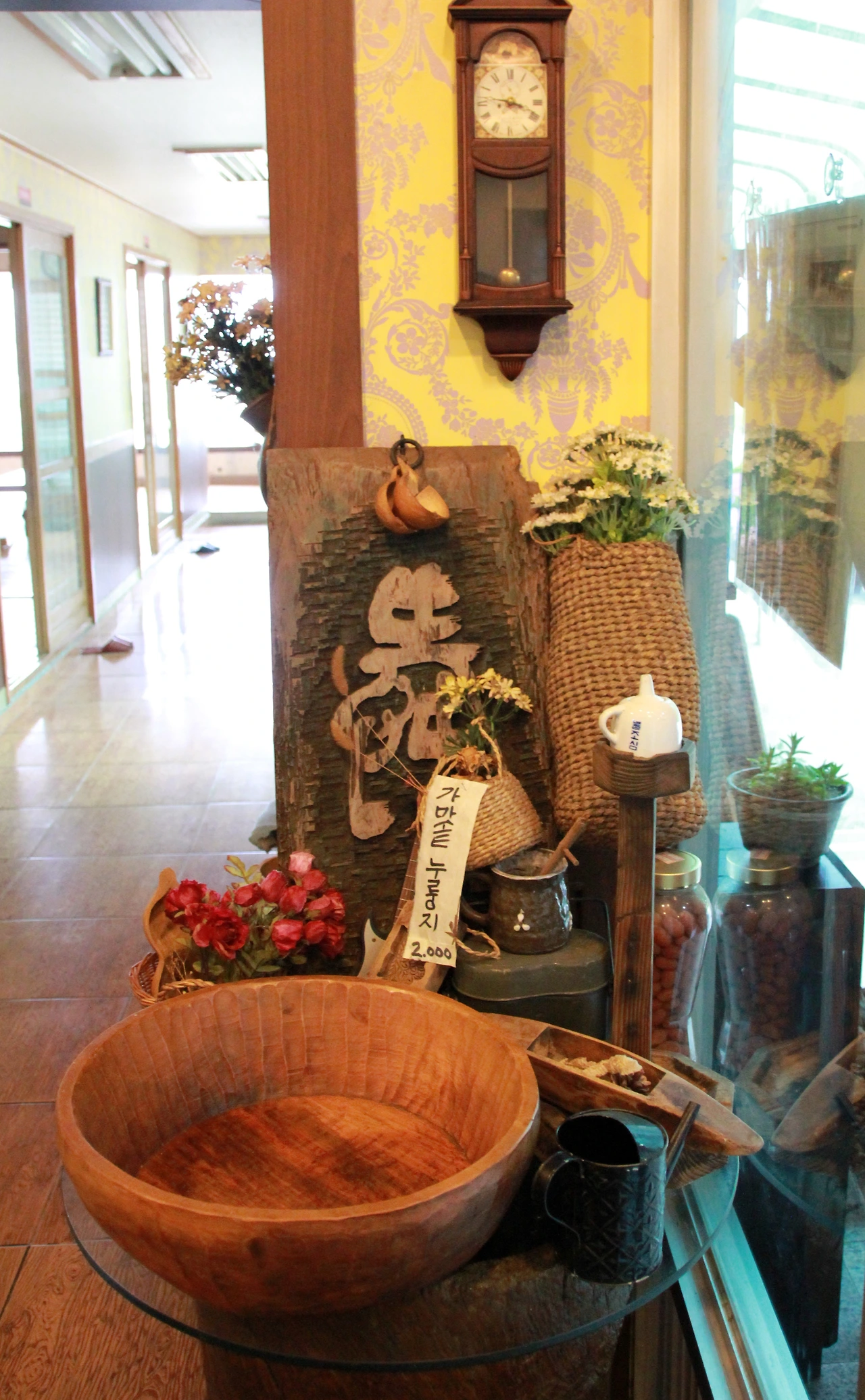 기자에게 하던 말을 끊고 ‘기다리라’면서 잠시 후 주방에서 직접 들고 나온 전도 쑥전, 시래기무밥 옆에 놓인 국도 쑥국이다. 오후 한가해지는 시간 짬 내어 한두 시간만 뜯어와도 넉넉하단다. 겨울산에서도 낙엽이나 솔방울 하나라도 들고와 한지실내등도 자연풍 장식하고, 전체 140명 수용규모인 이 방 저 병도 자연 자체가 그득이다. 결혼 초 14년여 해왔던 인테리어업이 식당에서도 재현되는 모양새이다. 출입구 안팎으로 즐비한 고풍창연 소품과 골동품들이 자연과 어울어진다. 마당의 진귀한 다육식물들도 손님들의 눈과 손을 타지만, 추녀 밑에 가지런 개켜올린 항아리 깨진 조각들도 손님들 눈에는 자연 예술이다.
