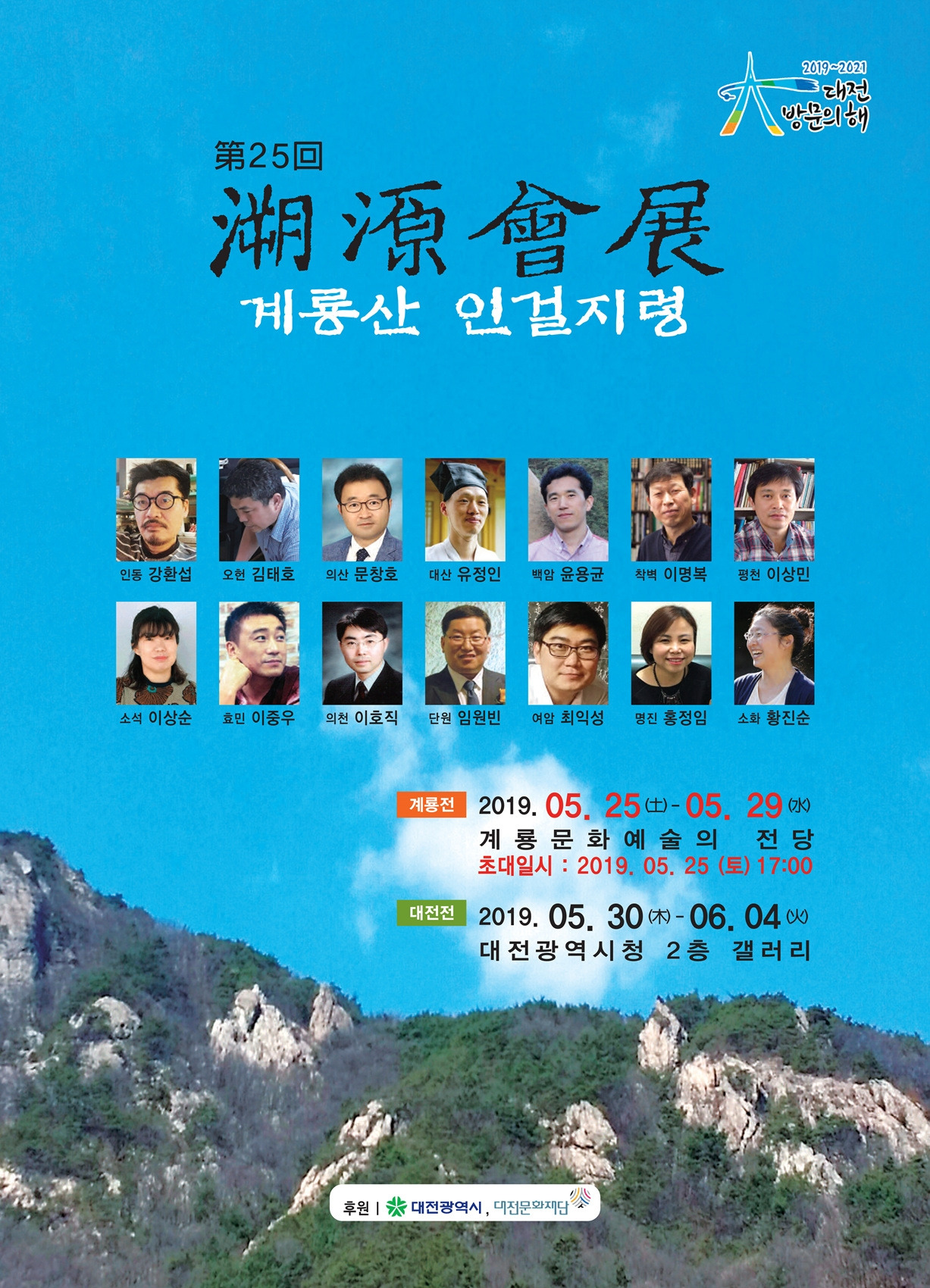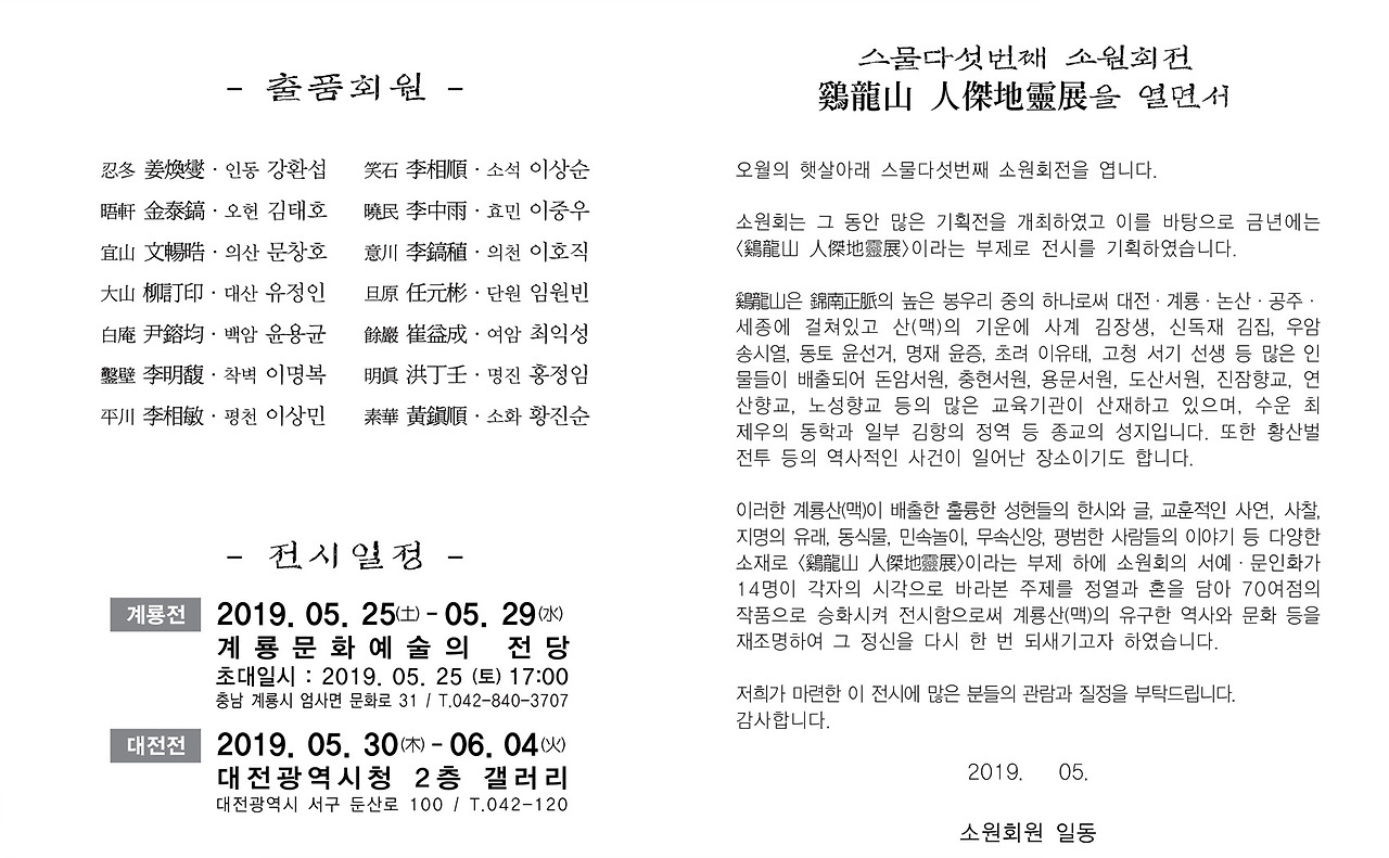 제25회 계룡산 인걸지령 계룡전이 5월 25~29일 계룡문화예술의 전당에서 열린다. 소원회의 서예·문인화가 14명이 각자의 시각으로 바라본 주제를 70여점의 작품으로 승화시켜 완성한 역작의 전시회이다.