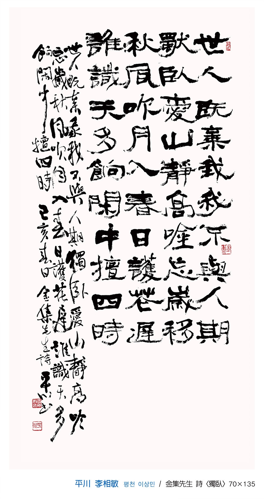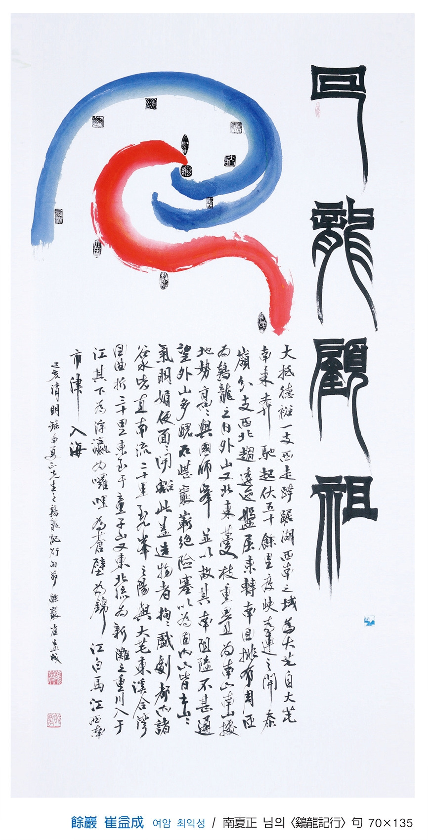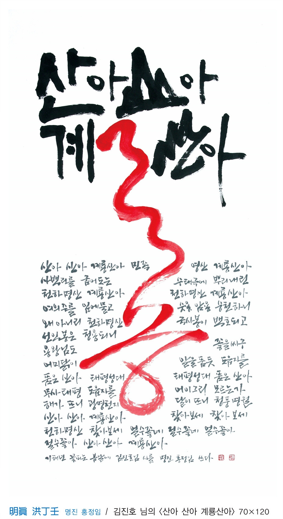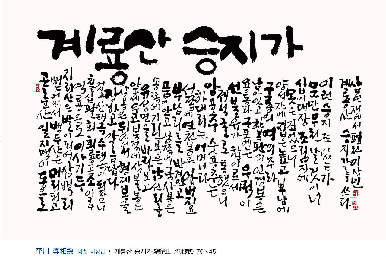계룡산(鷄龍山)과 인걸지령(人傑地靈)이라는 이름이 다소 묵직하게 보인다. 단순한 서예, 문인화 전시분위기가 아님은, 작품의 예술성에서도 그러하지만 기록된 내용으로 들어갈 때 더 실감키워진다. 계룡산 인근에는 영험한 계룡산 정기가 배출한 인걸들이 즐비하다. 유명 무명의 성현들 한시와 글, 교훈적인 사연, 사찰, 지명의 유래, 동식물, 민속놀이, 무속신앙, 평범한 사람들의 이야기 등 다양한 소재가 <鷄龍山 人傑地靈>에 담겨 있다.
