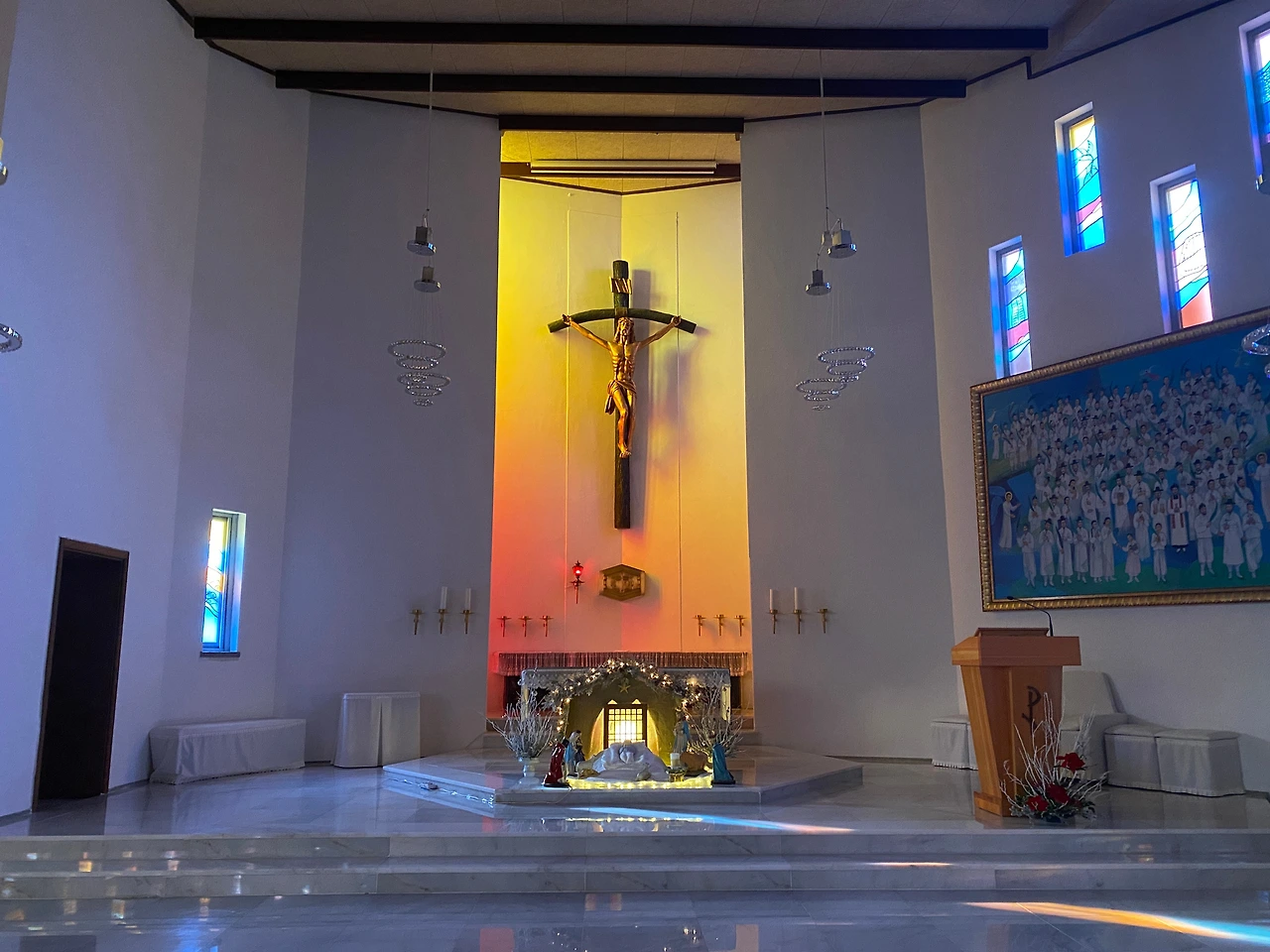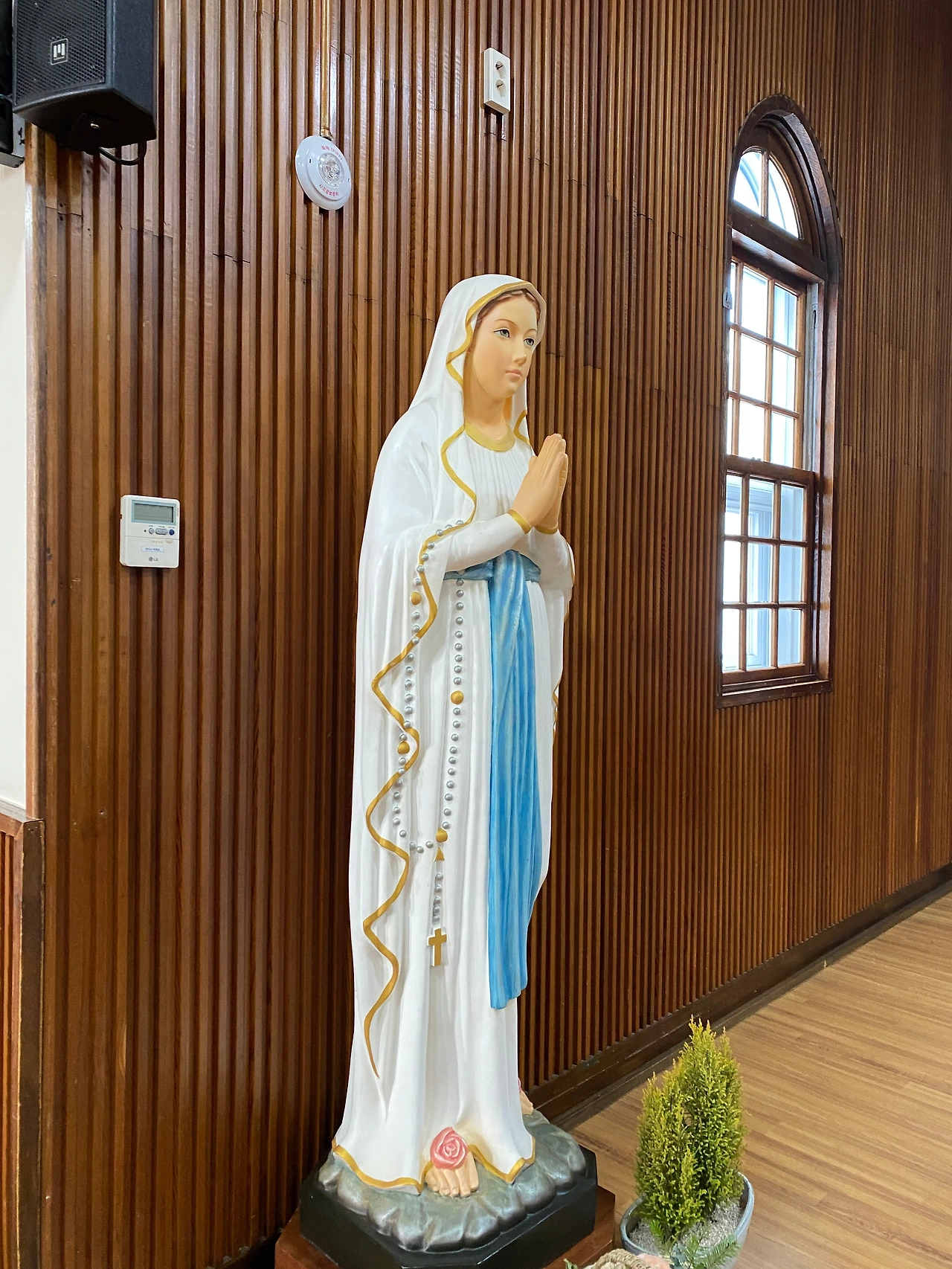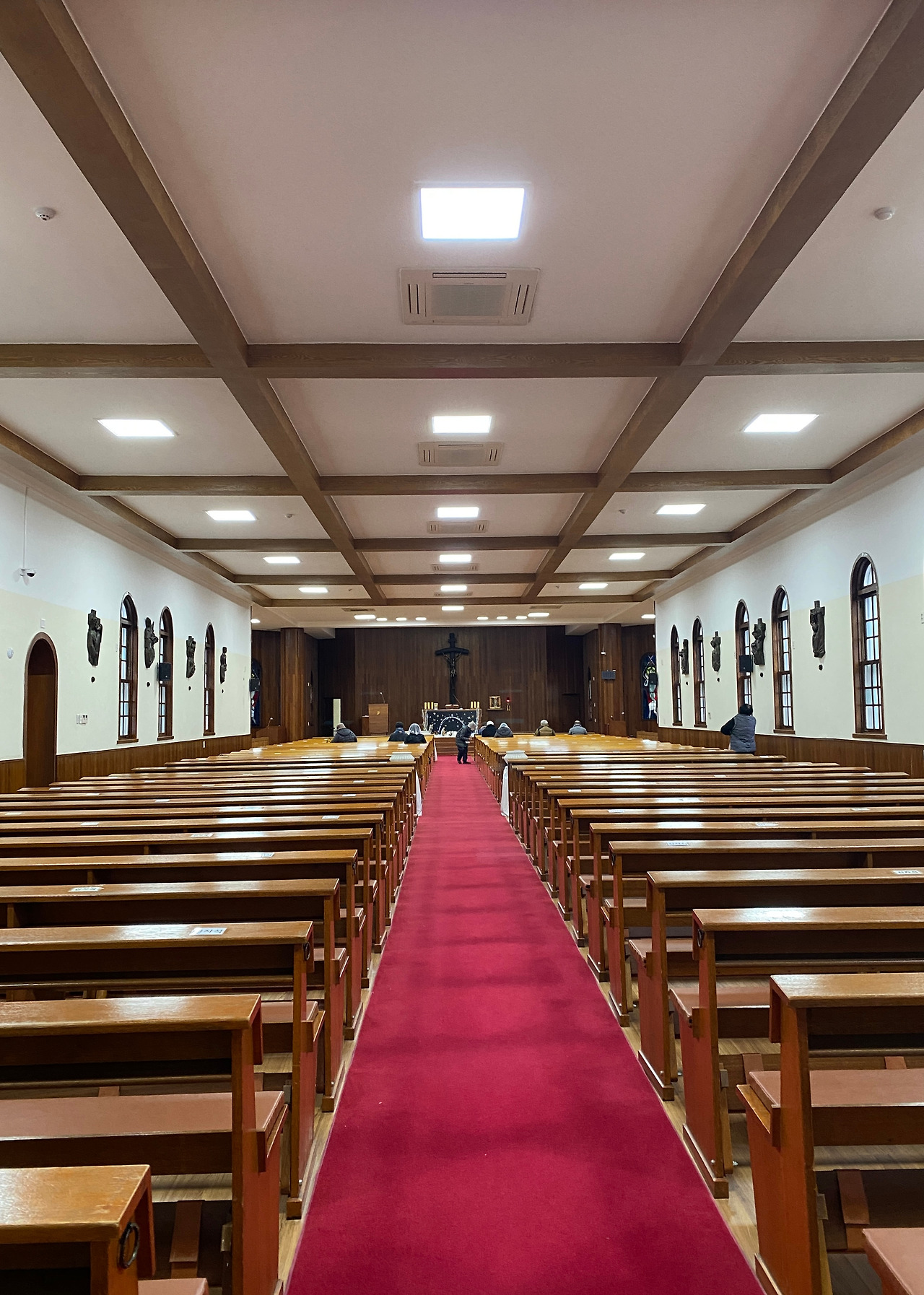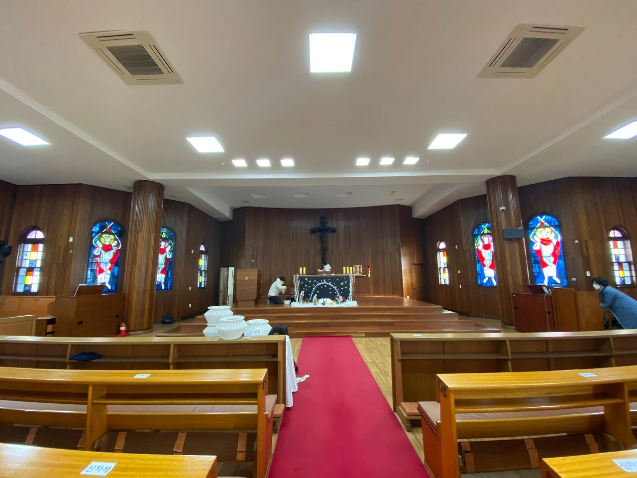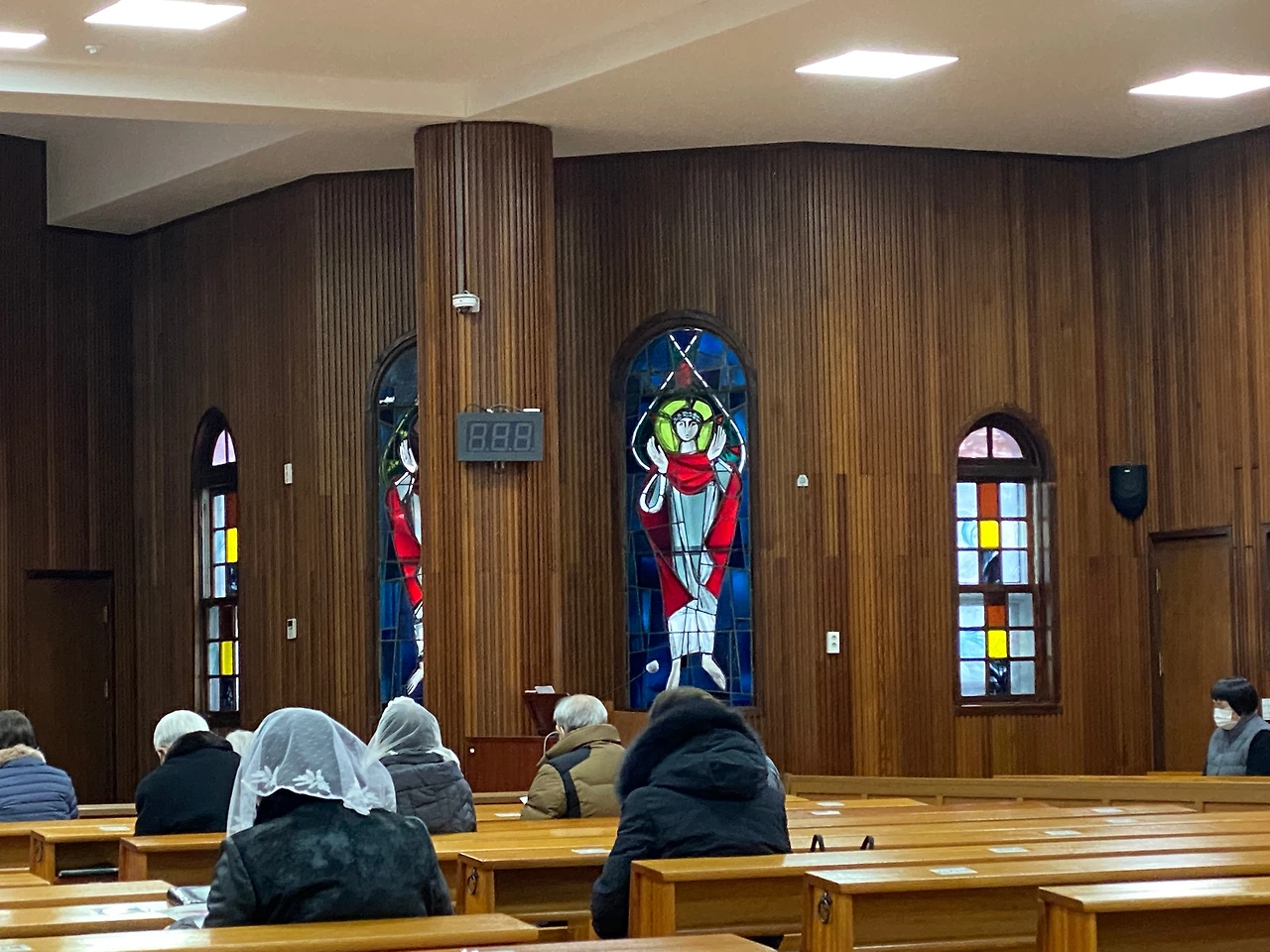 자리에 앉기전에 본당내부를 간단히 둘러보고 경건한 마음으로 회중석의 한자리에 앉습니다. 생각보다 많치않은 신자들이 앞자리에 앉아있습니다. 미사시작이 10시인줄 알았는데 주보를 보니 10:30분입니다. 미사시간을 잘못알았던 것인데 이후로는 꼭 사무실에 전화를 하고 미사시간을 확인하게 되었습니다. 시간이 지나자 많은 분들이 자리에 앉습니다. 족히 200명은 되어보입니다. 코로나가 창궐한 시기라 듬성듬성 표시된 자리에 앉고 이내 미사를 기다리는 경건한 마음들이 본당안을 가득 채웁니다.