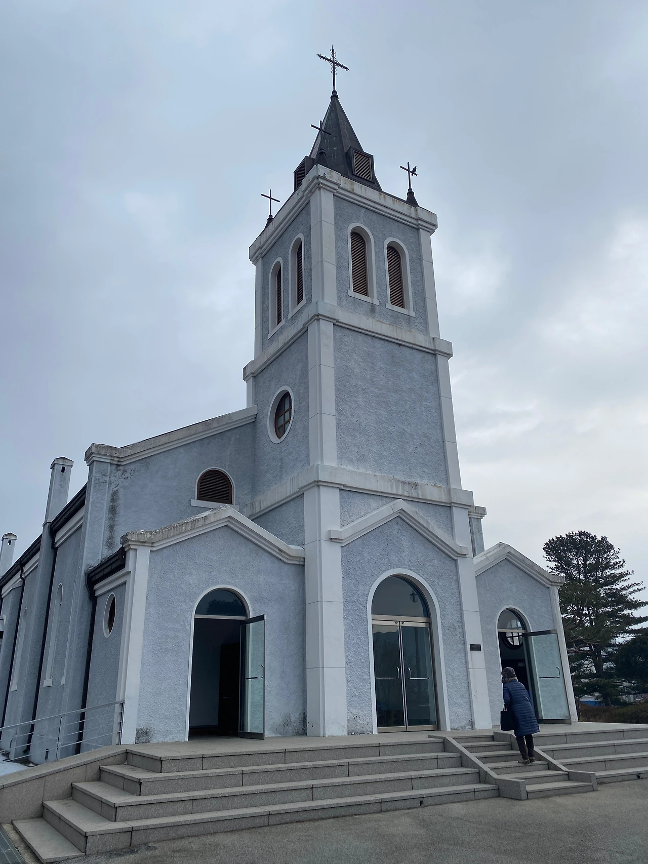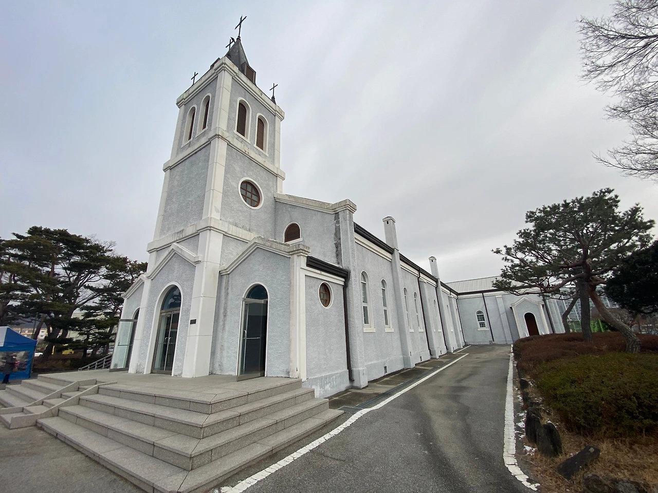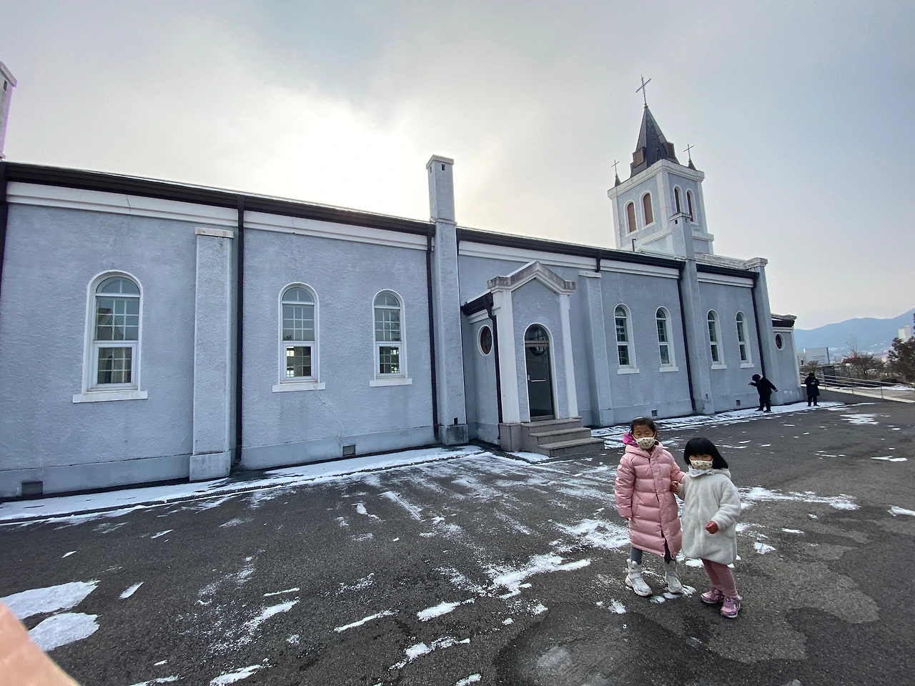 이른아침 새해를 시작하는 설레는 마음이 성당여행으로 더해졌습니다. 전날 검색해보니 옥천성당의 교중미사가 오전 10시로 확인됩니다. 대구에서 1시간30분쯤 걸리는 거리니 8시쯤 출발합니다. 10시에 못미쳐 도착한 옥천성당의 주차장. 도착해서 보니 몇사람이 성당쪽에서 내려오는 것이 보입니다. 미사시간을 잘못알았나 하는 불안감이 들었습니다. 주차장에서 올려다보니 야트막한 언덕위로 잔가지에 살짝 가려진 옥천성당의 첨탑이 보입니다. 옅고 푸른색의 종탑. 둥근아치와 마치 한옥창문을 보는 듯한 등근 창. 아직 본당에 들어서기 전인데도 벌써부터 마음이 설렙니다. 좁은 길을 따라 언덕위에 있는 성당으로 서둘러 올라갔습니다. 본당으로 들어가는 몇사람이 보입니다. 다행히도 아직 미사전입니다. 이미 몇차례 검색으로 본당안의 모습을 본터라 낮설진 않았지만 세로로 길게 두줄로 가른 회중석이 생각보다 길어보입니다. 어름 직작해도 한줄에 40줄은 넘어보입니다. 짐작해보건데 300명은 족히 앉을 수 있는 자리니 옥천성당의 신자수를 가름해볼 수가 있었습니다.