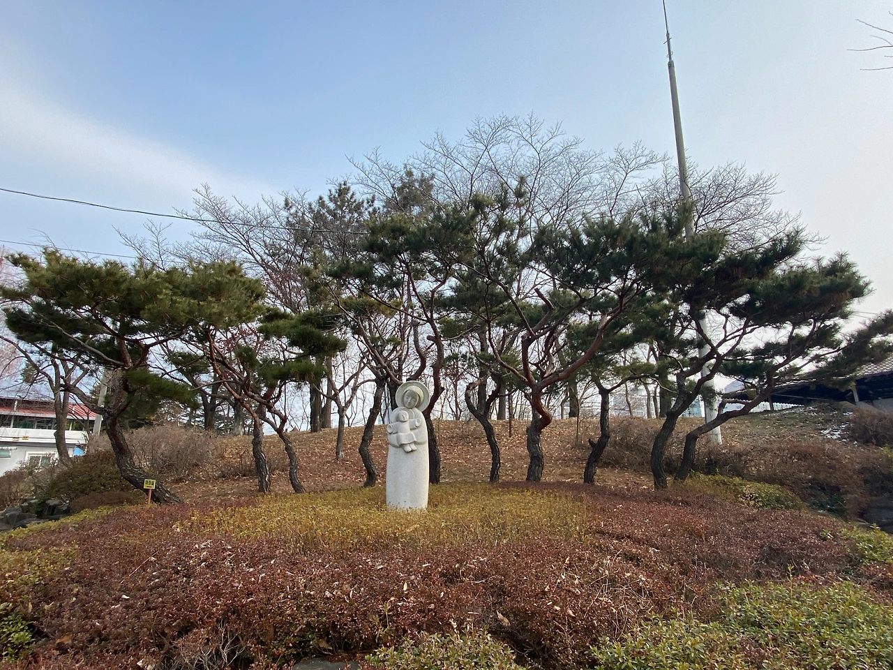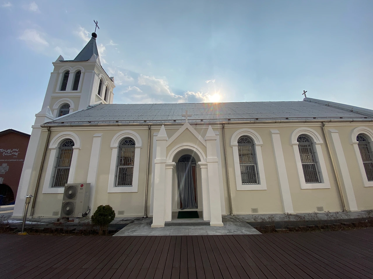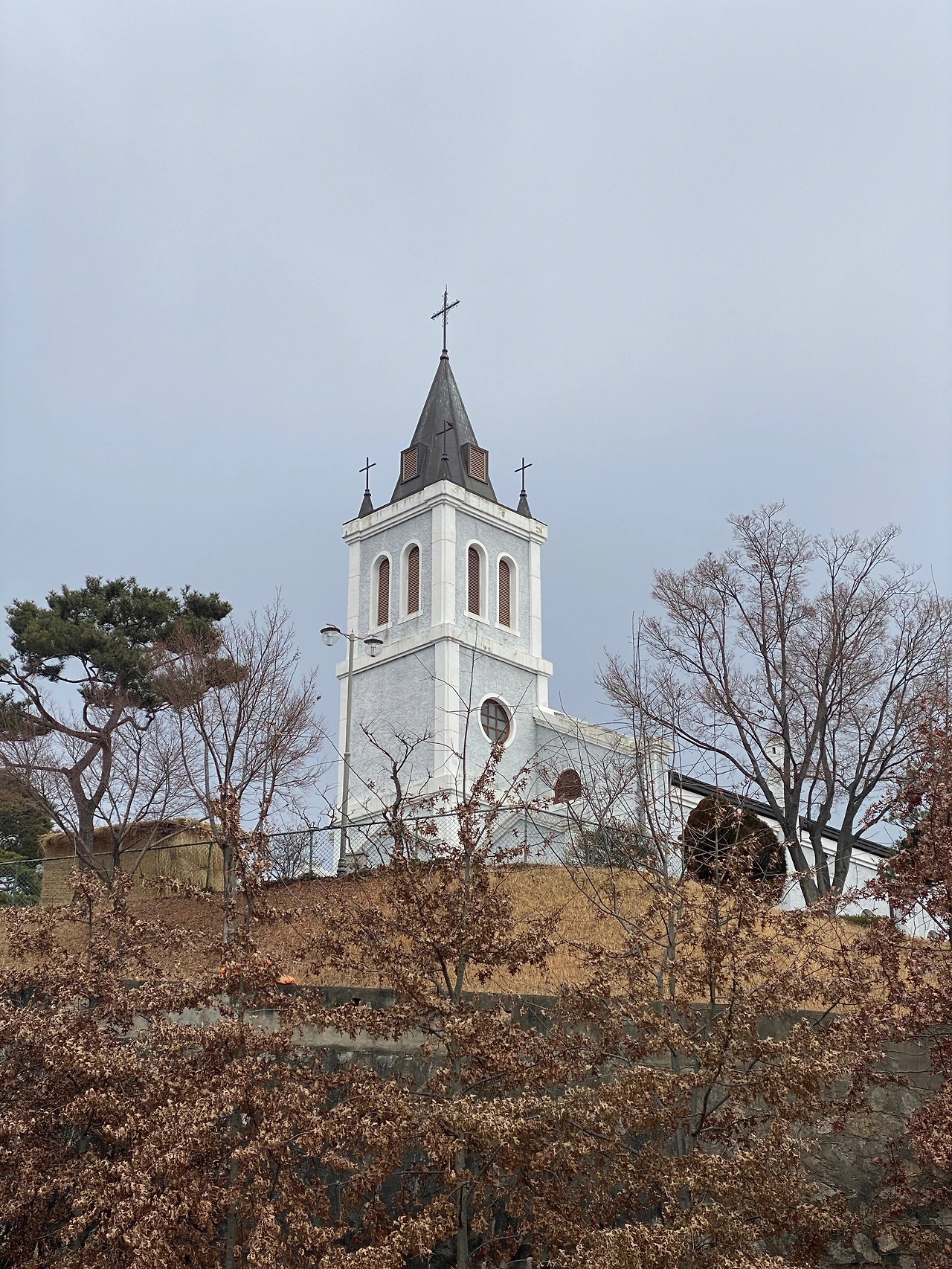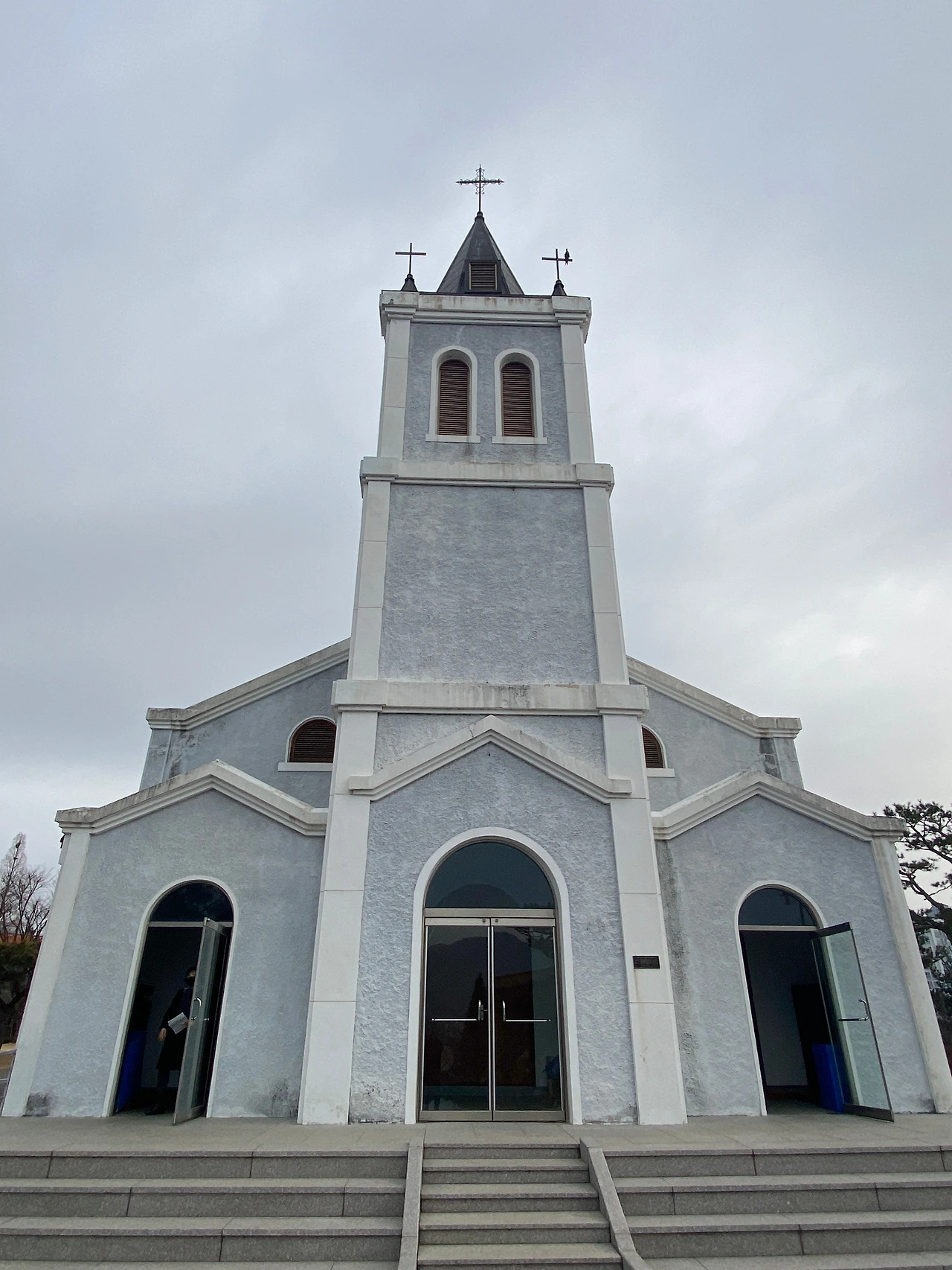 이른아침 새해를 시작하는 설레는 마음이 성당여행으로 더해졌습니다. 전날 검색해보니 옥천성당의 교중미사가 오전 10시로 확인됩니다. 대구에서 1시간30분쯤 걸리는 거리니 8시쯤 출발합니다. 10시에 못미쳐 도착한 옥천성당의 주차장. 도착해서 보니 몇사람이 성당쪽에서 내려오는 것이 보입니다. 미사시간을 잘못알았나 하는 불안감이 들었습니다. 주차장에서 올려다보니 야트막한 언덕위로 잔가지에 살짝 가려진 옥천성당의 첨탑이 보입니다. 옅고 푸른색의 종탑. 둥근아치와 마치 한옥창문을 보는 듯한 등근 창. 아직 본당에 들어서기 전인데도 벌써부터 마음이 설렙니다. 좁은 길을 따라 언덕위에 있는 성당으로 서둘러 올라갔습니다. 본당으로 들어가는 몇사람이 보입니다. 다행히도 아직 미사전입니다. 이미 몇차례 검색으로 본당안의 모습을 본터라 낮설진 않았지만 세로로 길게 두줄로 가른 회중석이 생각보다 길어보입니다. 어름 직작해도 한줄에 40줄은 넘어보입니다. 짐작해보건데 300명은 족히 앉을 수 있는 자리니 옥천성당의 신자수를 가름해볼 수가 있었습니다.