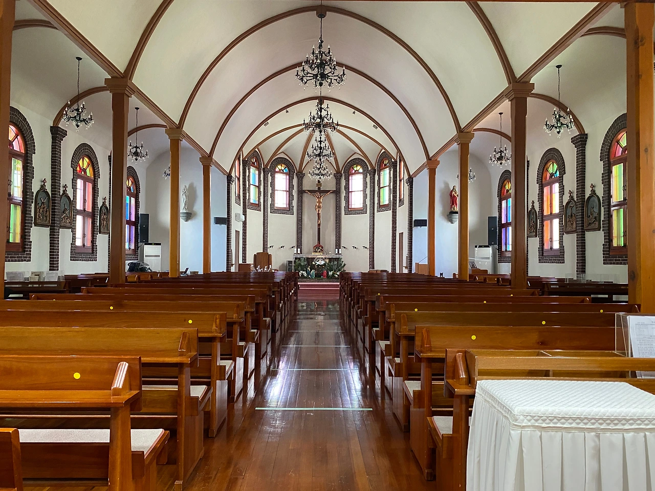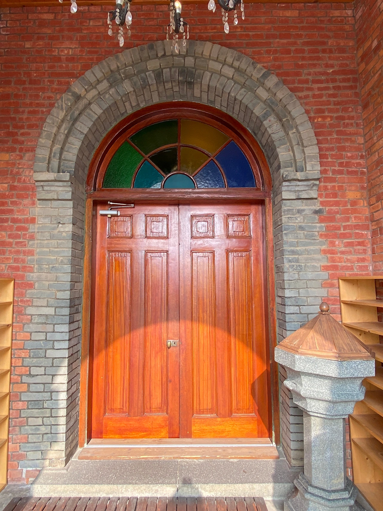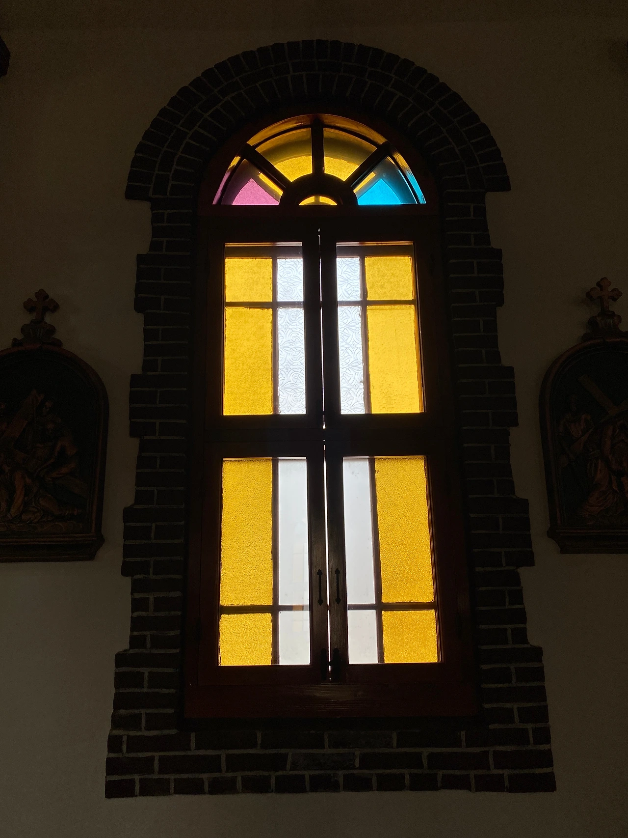 성당 안은 눈이 휘둥그레 해질 만큼 아름다웠다. 흰색 바탕의 천정과 그래서 더 뚜렷하게 보이는 목골, 아치형 스테인 글라스 창문엔 검은색 벽돌을 둘러 포인트를 주니 눈에 확 들어오고, 스테인글라스를 뚫고 들어오는 창연한 햇살을 더욱 아름답게 했다. 제대 쪽은 반원형으로 안으로 움푹 들어가 있는 모습이다. 그러다 보니 중앙에 십자고상이 한눈에 들어와 예수님의 고통이 그대로 전해지는 듯했다. 회중석은 이 지역 성당의 특색인지 3등분된 삼랑식 구조로 되어있다. 주랑은 목조로 되어있다. 성당의 아름다움에 취해 한참을 둘러보다 밖으로 나왔다. 들어갈 땐 보지 못했던 입구 양쪽의 둥근 스테인 글라스 창이 눈에 확 들어왔다. 오래된 문들도 세월의 흔적이 묻어있어 더욱 은은한 빛을 내는 듯했다